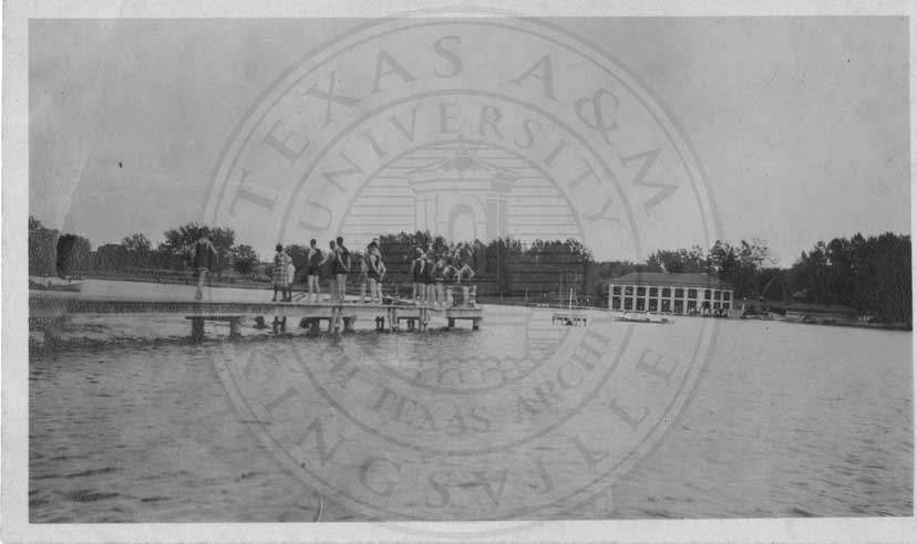 Photograph of people on a pier. |