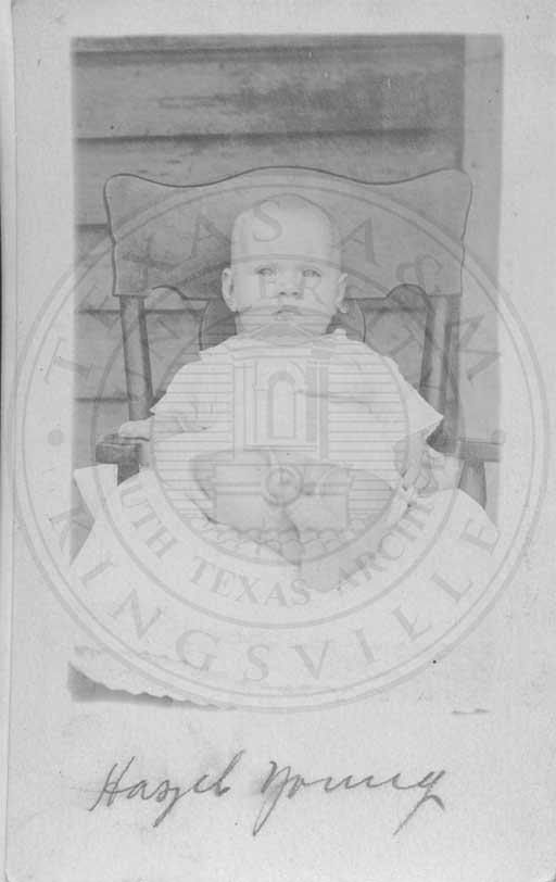 Young baby in chair,caption:"Hazel Young" |