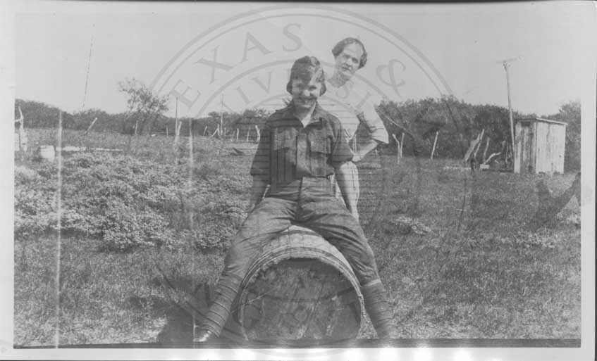 Photograph of Mabel Watson astride a barrel and an unidentified woman standing behind her. |