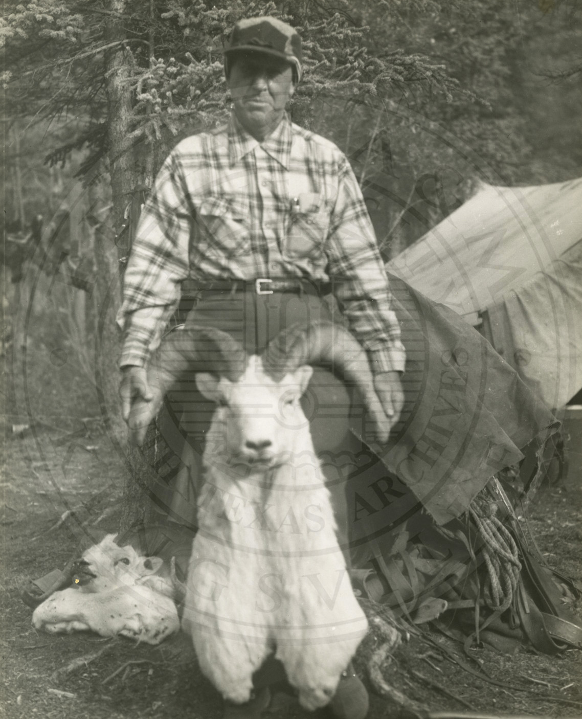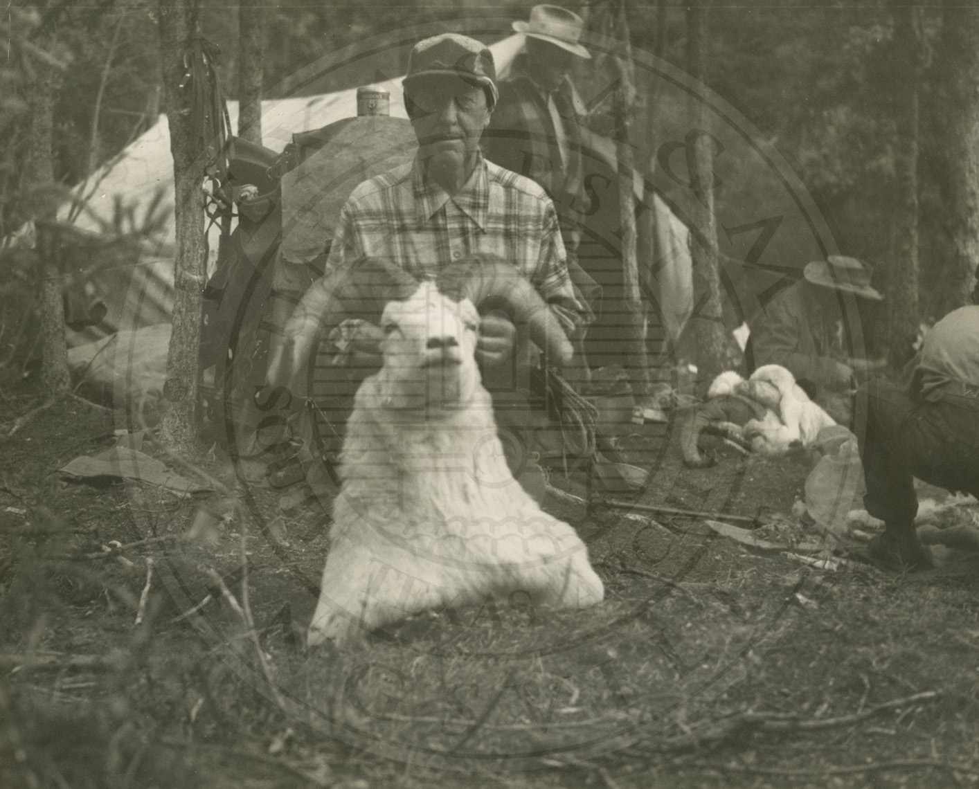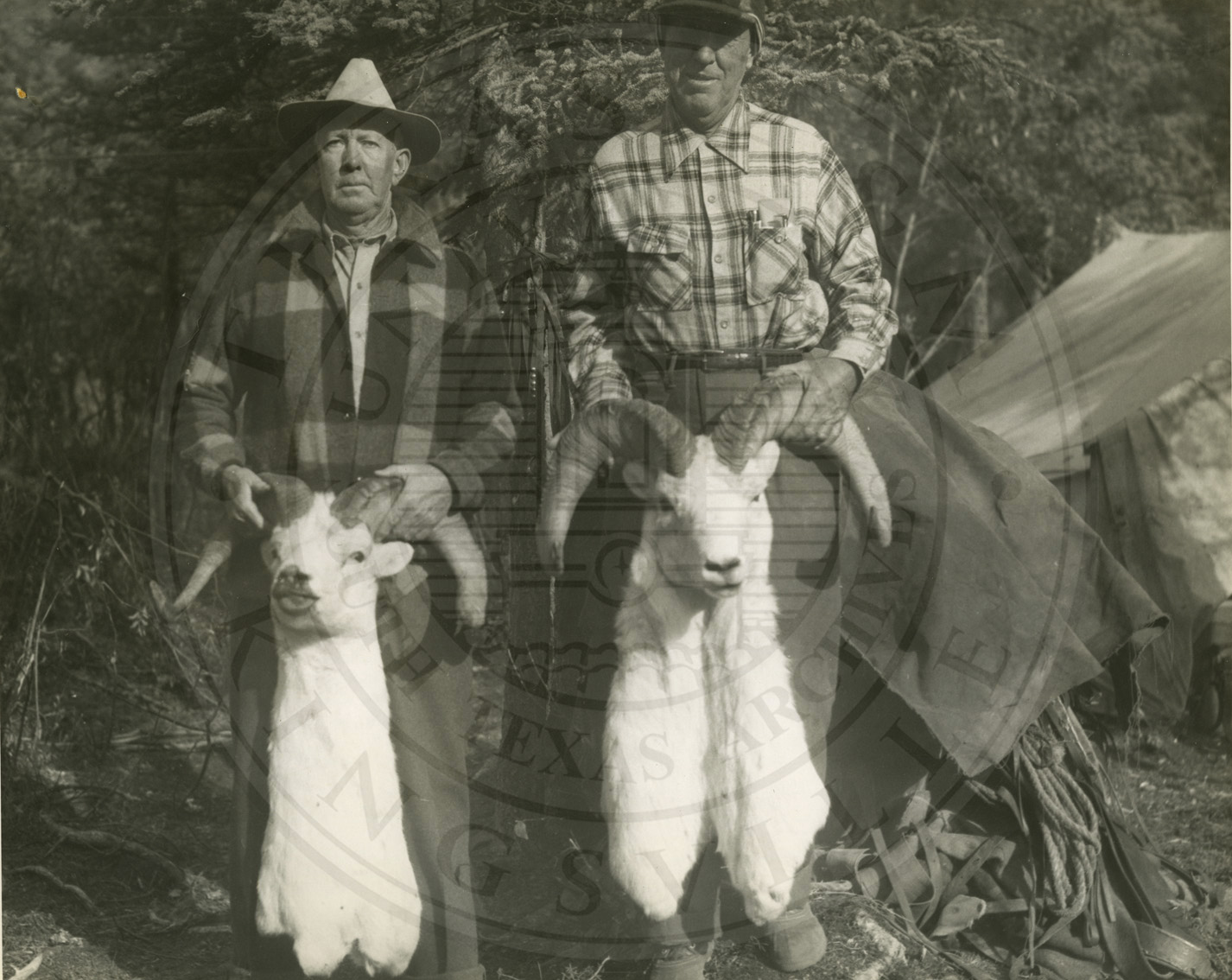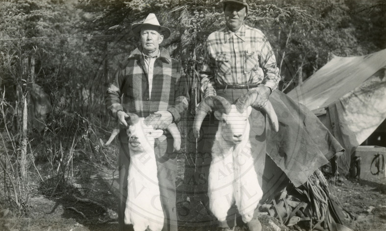 Two men holding two male Dall sheep by their horns. Ed Campbell on the left. |