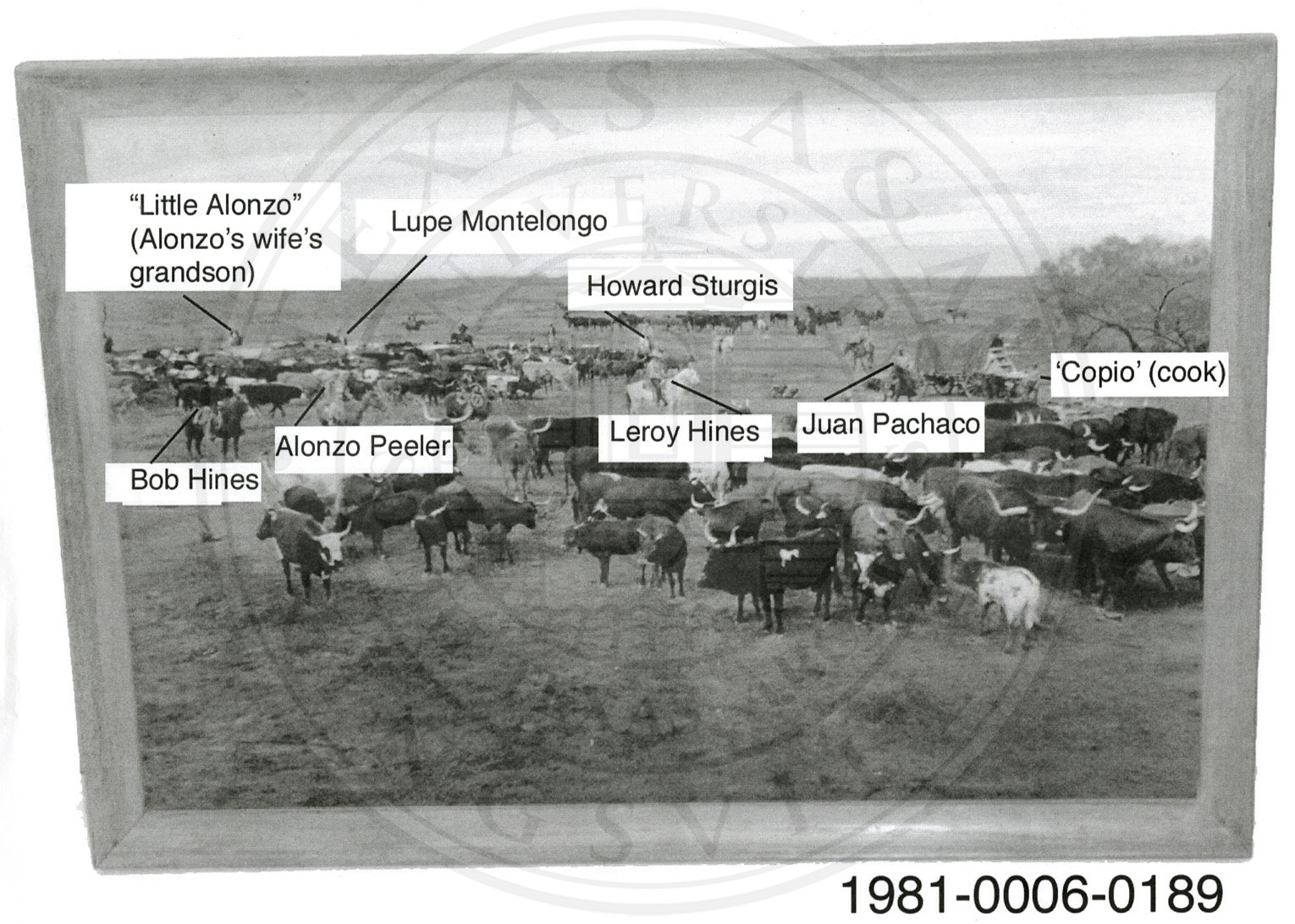Copy of a photo of a cattle drive with arrows and names pointed to the respective cowboys. Names read, from left to right: