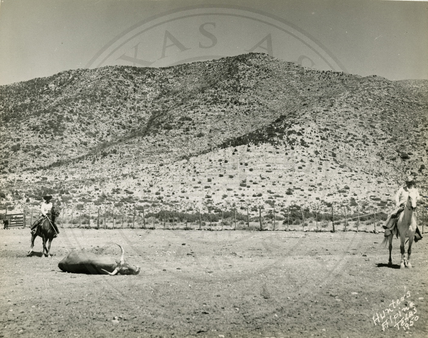 Two man cattle roping a steer. Caption reads:
