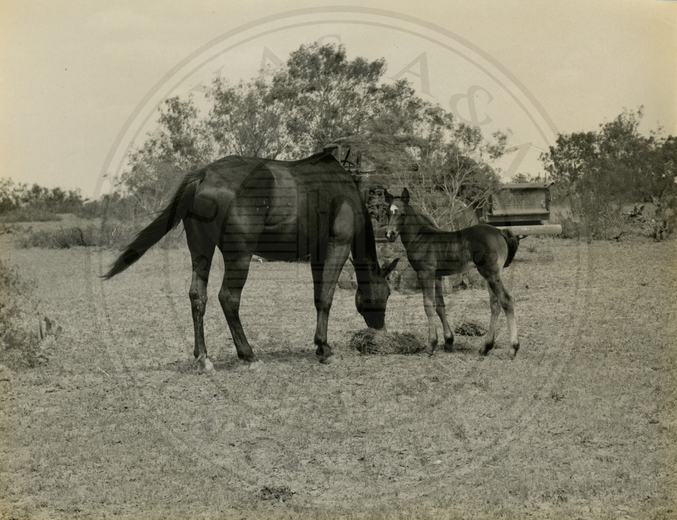Brown mare accompanied by her colt. |
