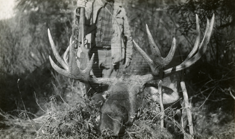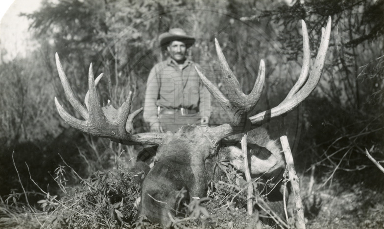 Deceased bull moose with a man in the background.