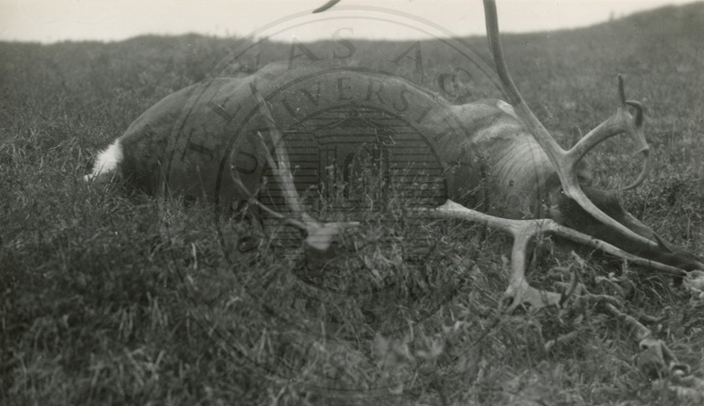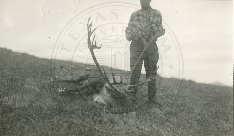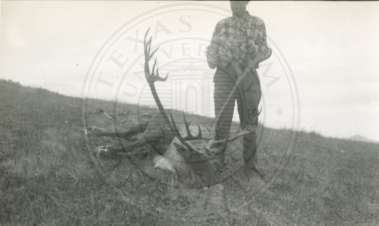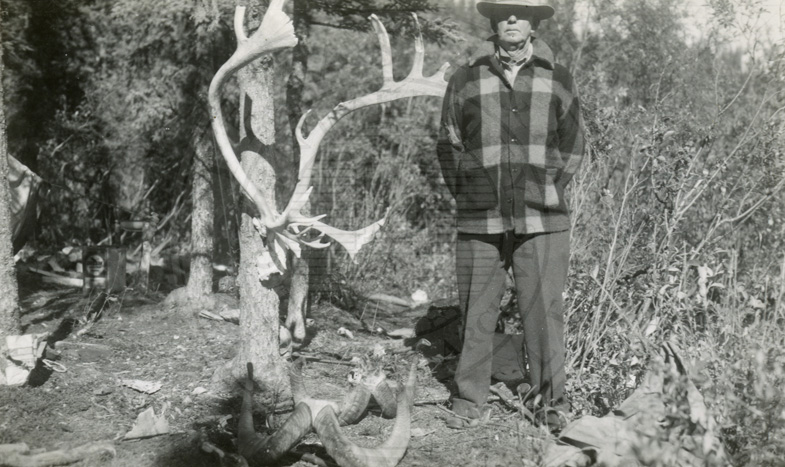 Man posing with dead caribou. |