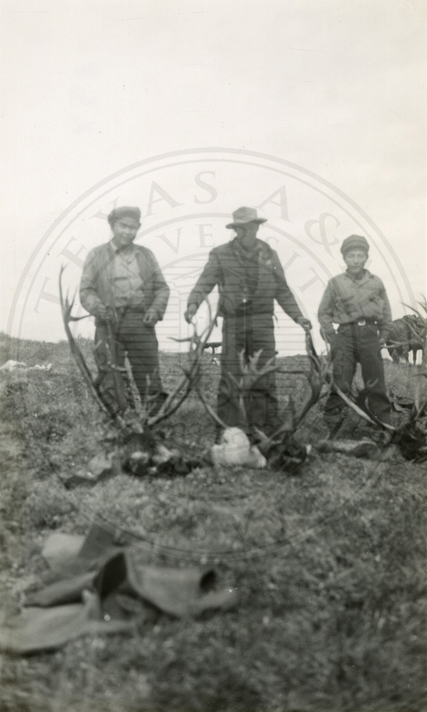 Three men posing with deceased caribou. |