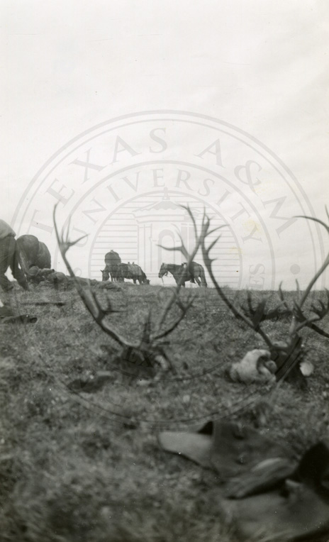 Caribou antlers with man and two horses in the background.