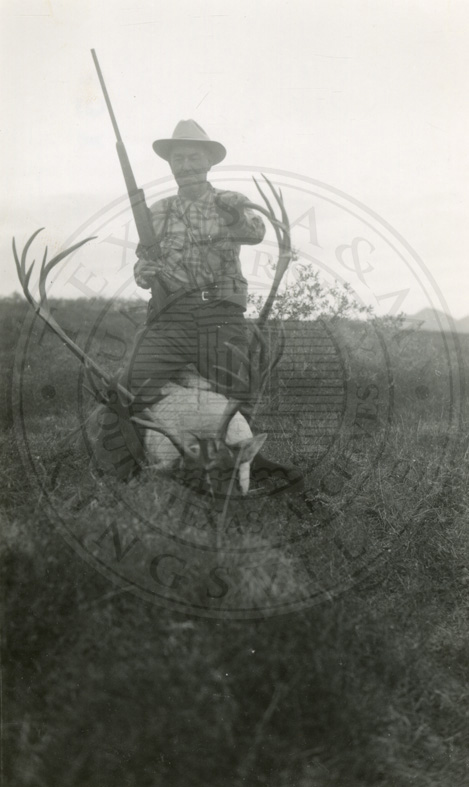 Man holding a rifle posing with his kill, a caribou. |