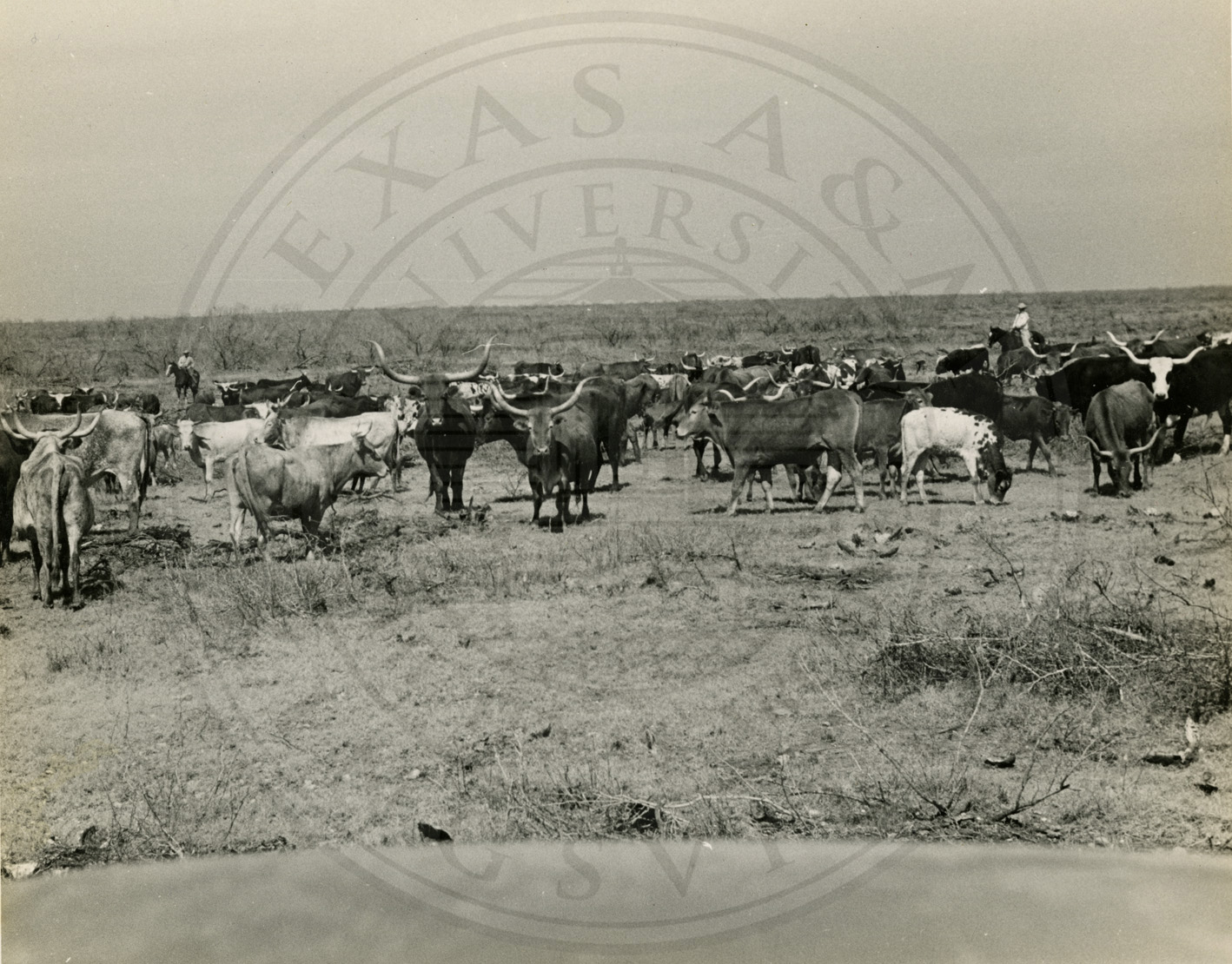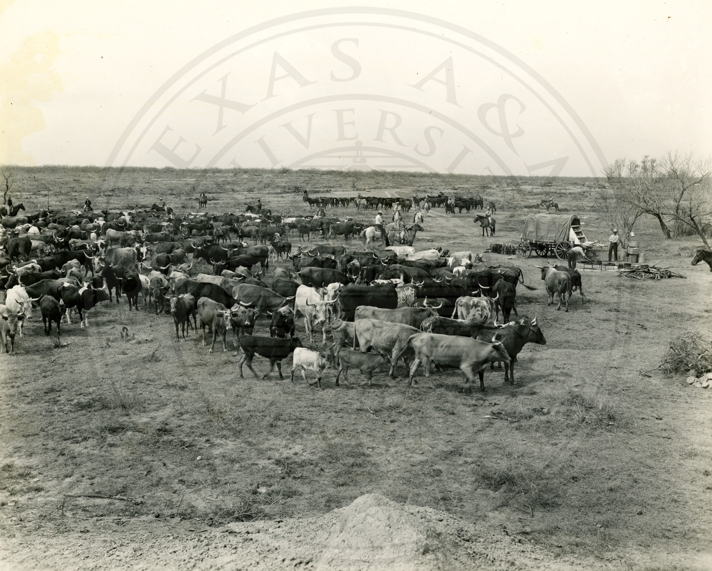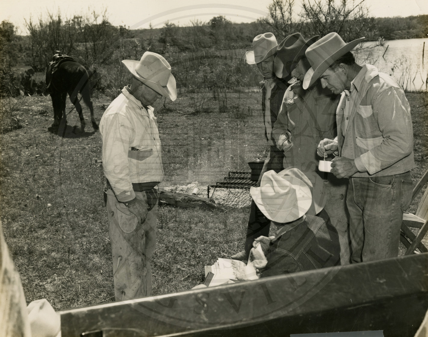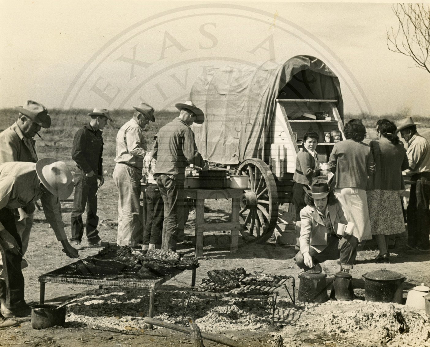 Chuckwagon dinner on Graves Peeler's ranch, McMullen County during a longhorn roundup. Notice the 'wineglass' brand on the chuckwagon cover, 1950s. |