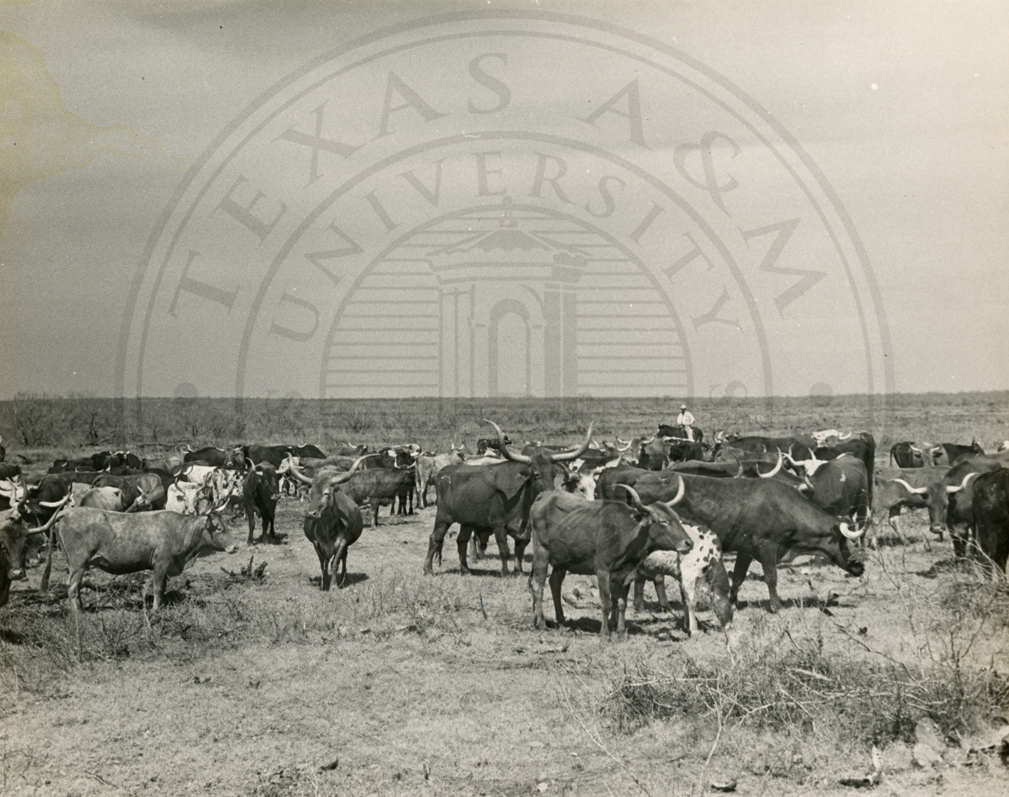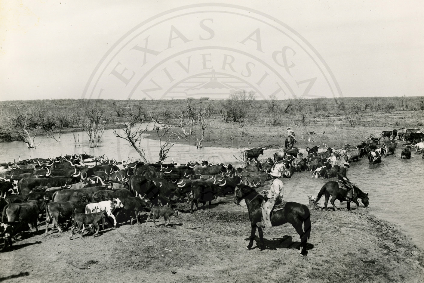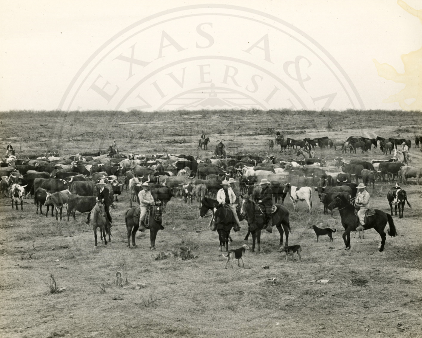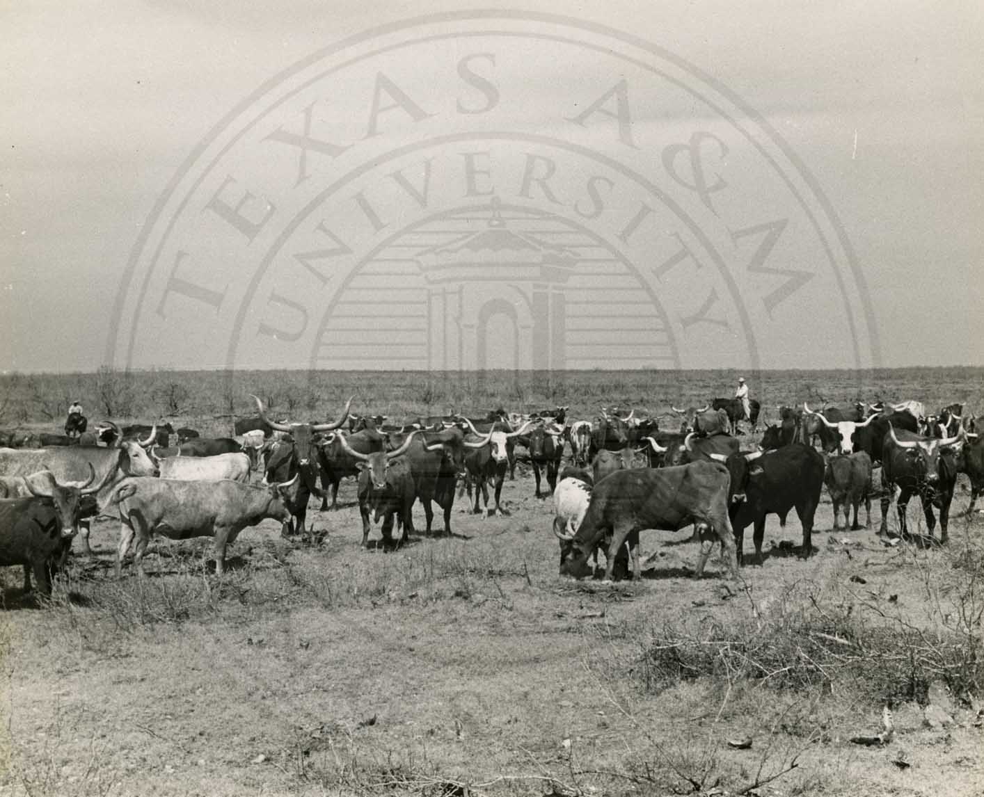 Chuckwagon dinner on Graves Peeler's ranch, McMullen County during a longhorn roundup. Notice the 'wineglass' brand on the chuckwagon cover, 1950s. |
