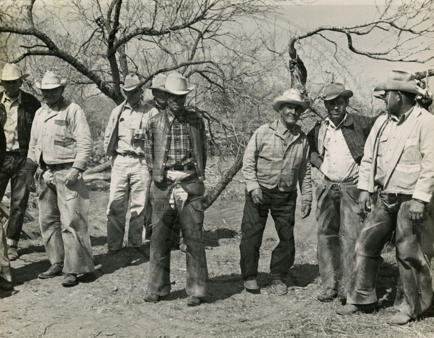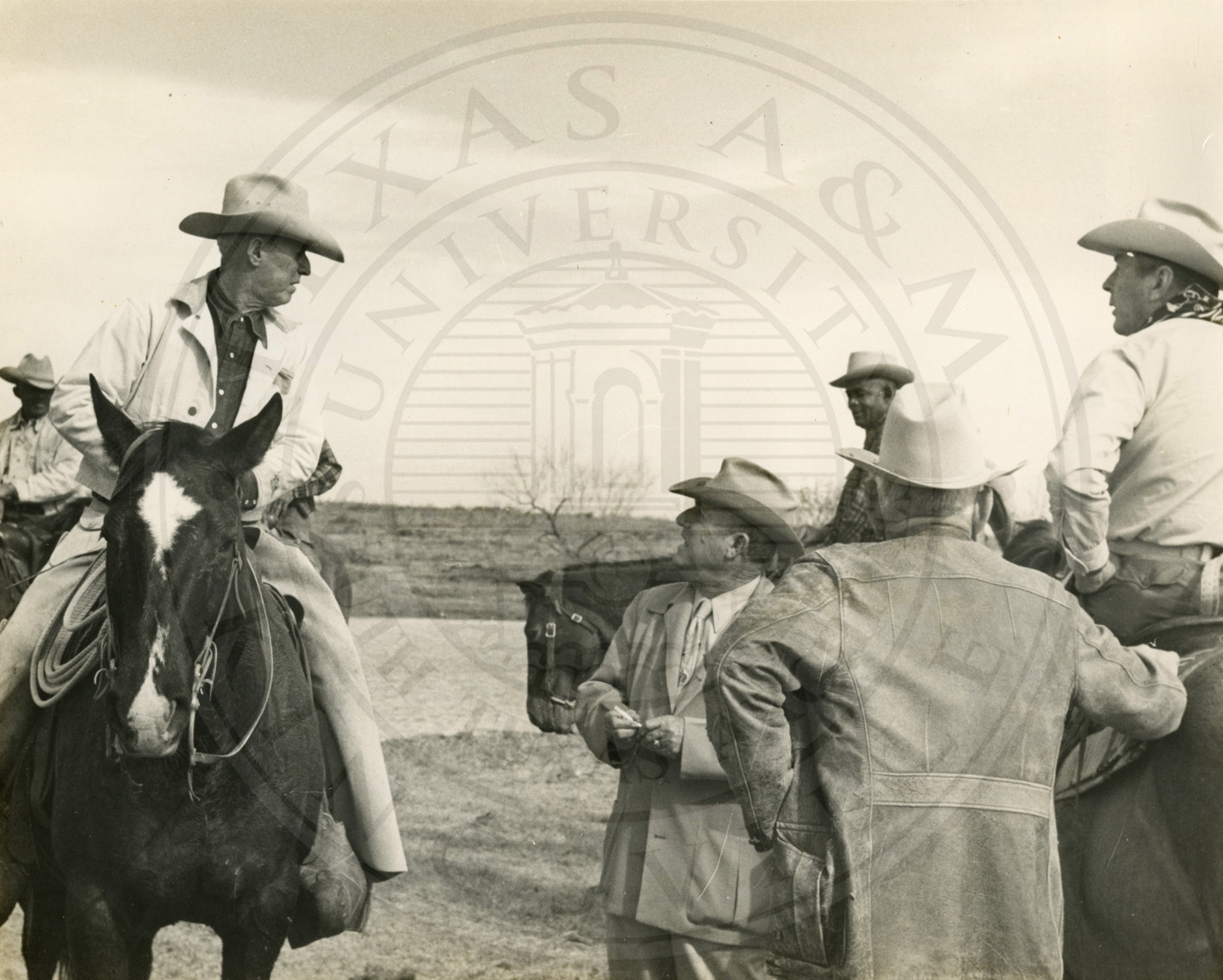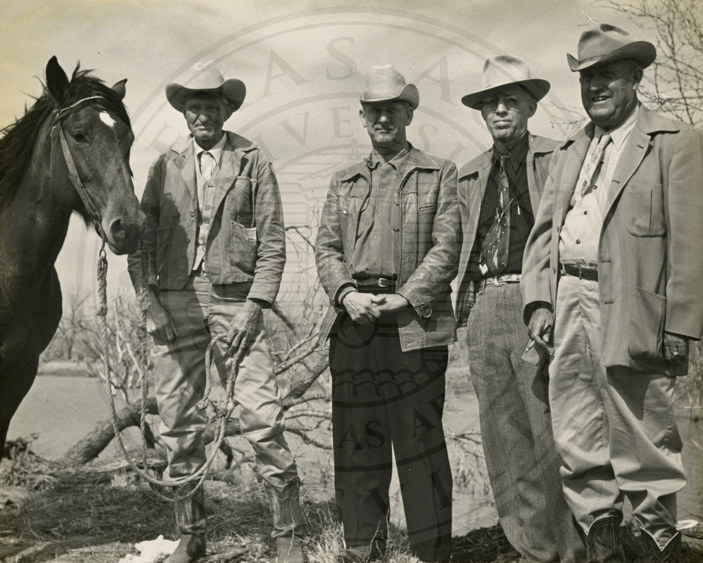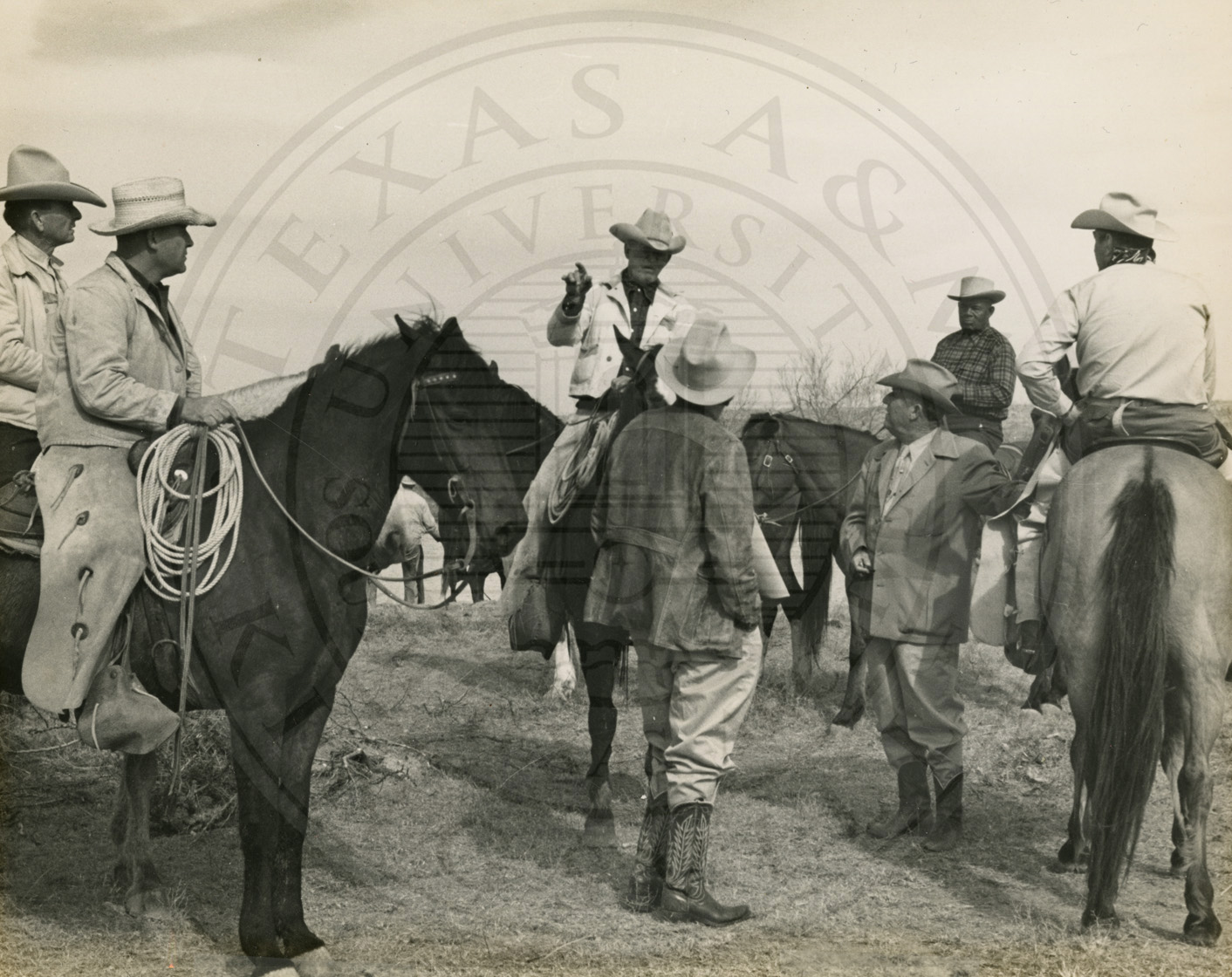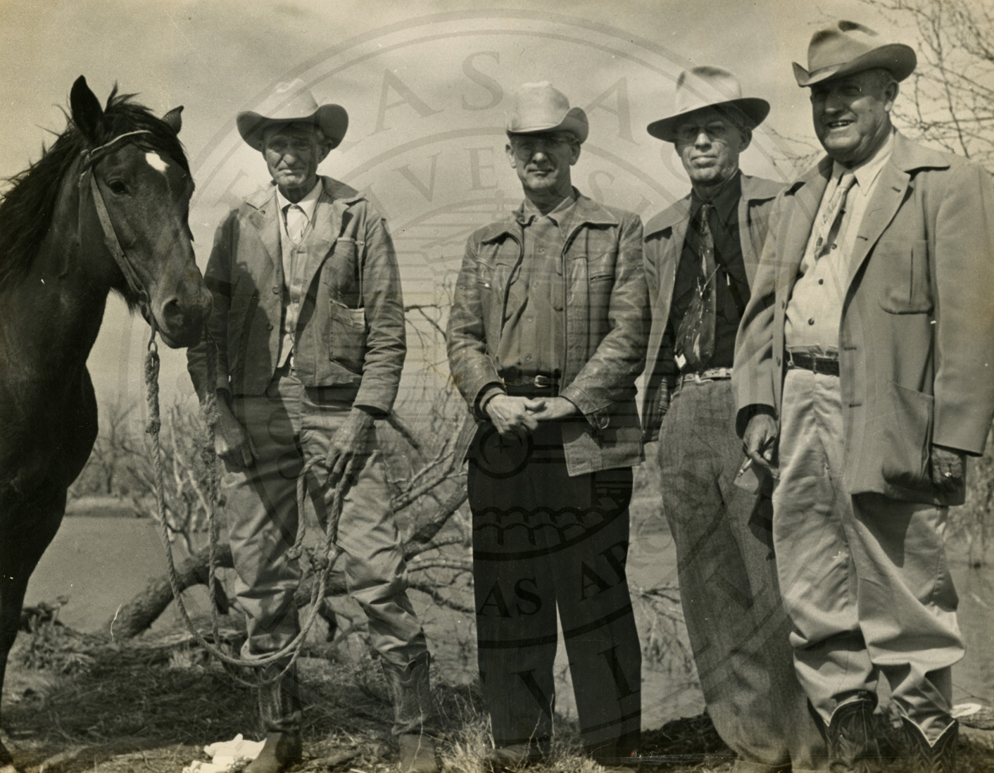 Left to Right Far left: Leroy Hindes, Jr. on horseback; unidentified man on horseback; Graves Peeler on horseback, pointing; unidentified man on horseback with back to camera; Alonzo Peeler, Sr. standing; unidentified man on horseback, unidentified man on horse with back to camera. 1950s.