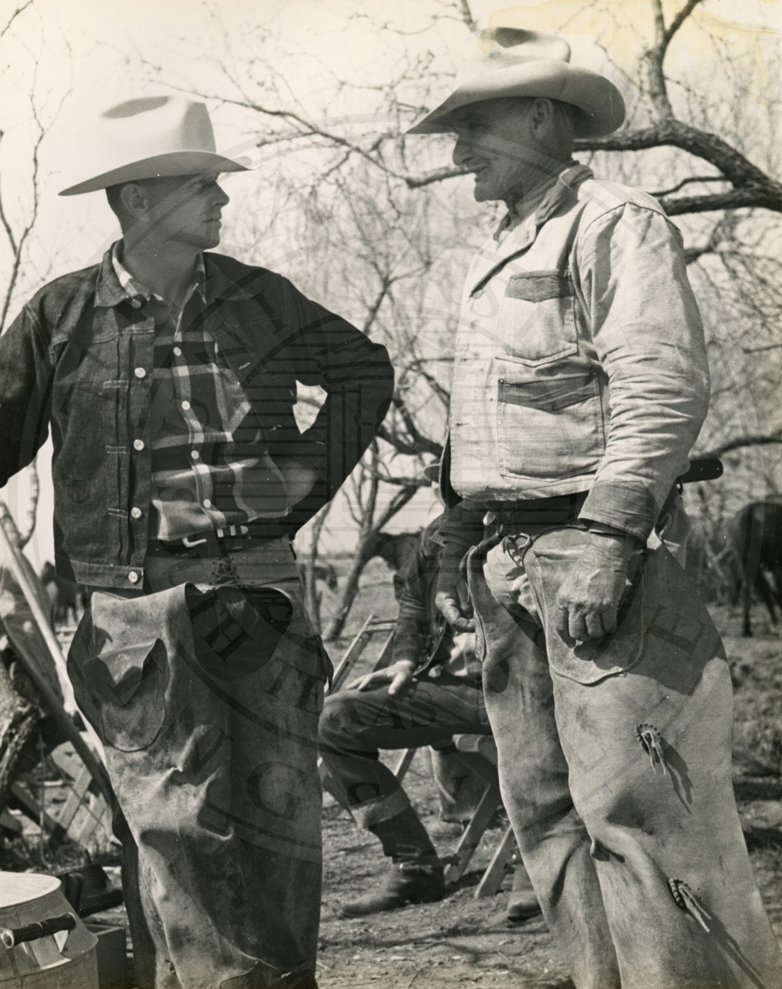 Graves Peeler on horseback, left, talking with Alonzo Peeler, Sr., standing. |