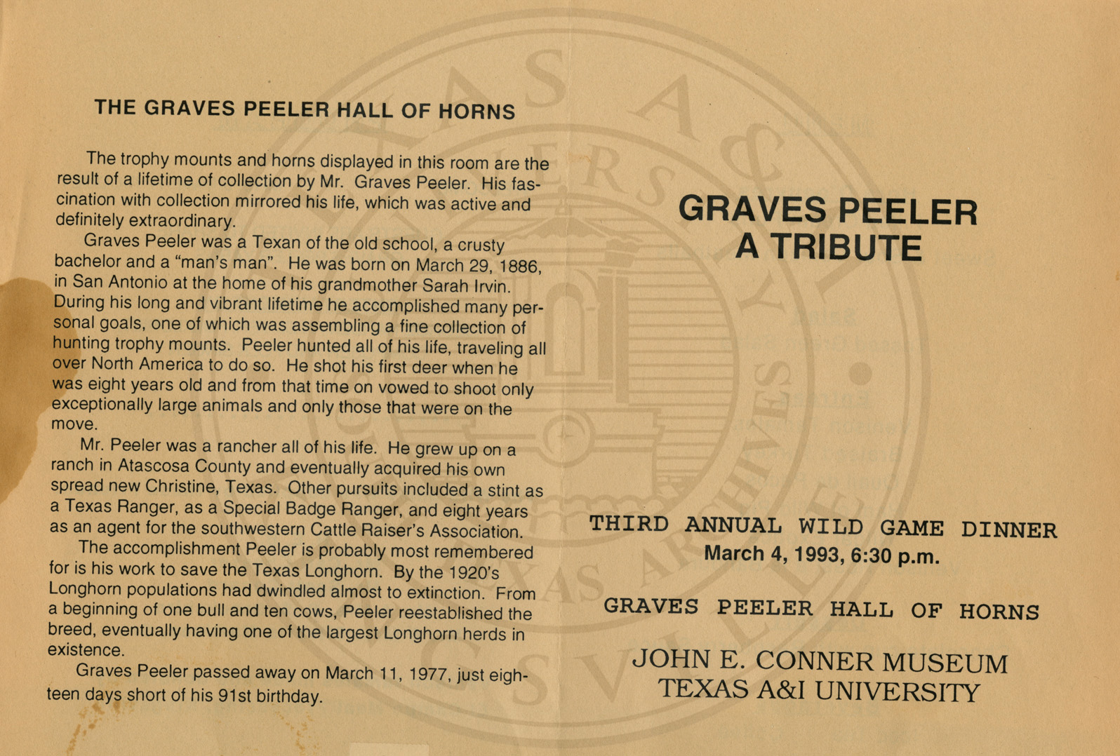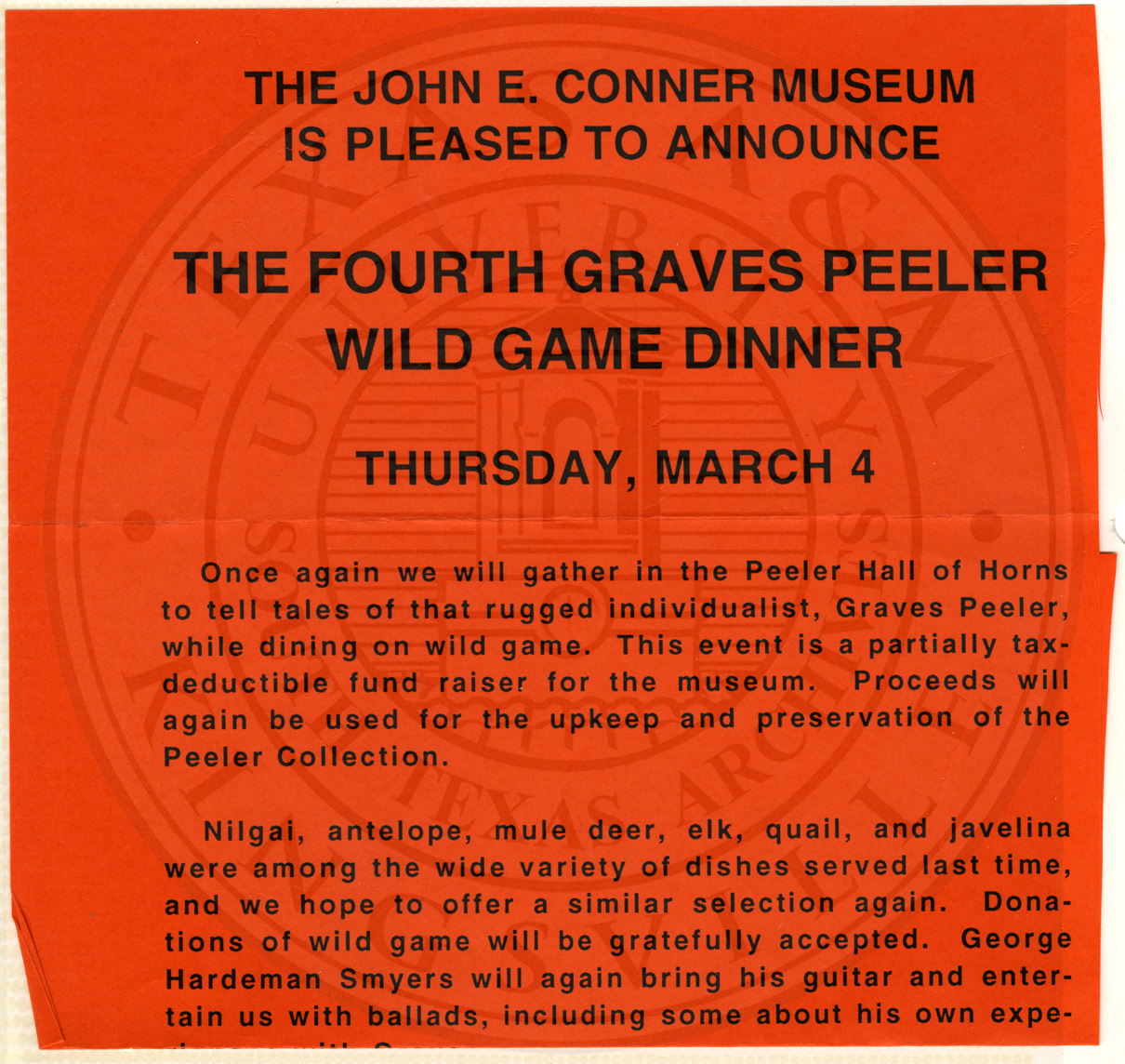 Flyer for Graves Peeler Wild Game Dinner at John E. Conner Museum |