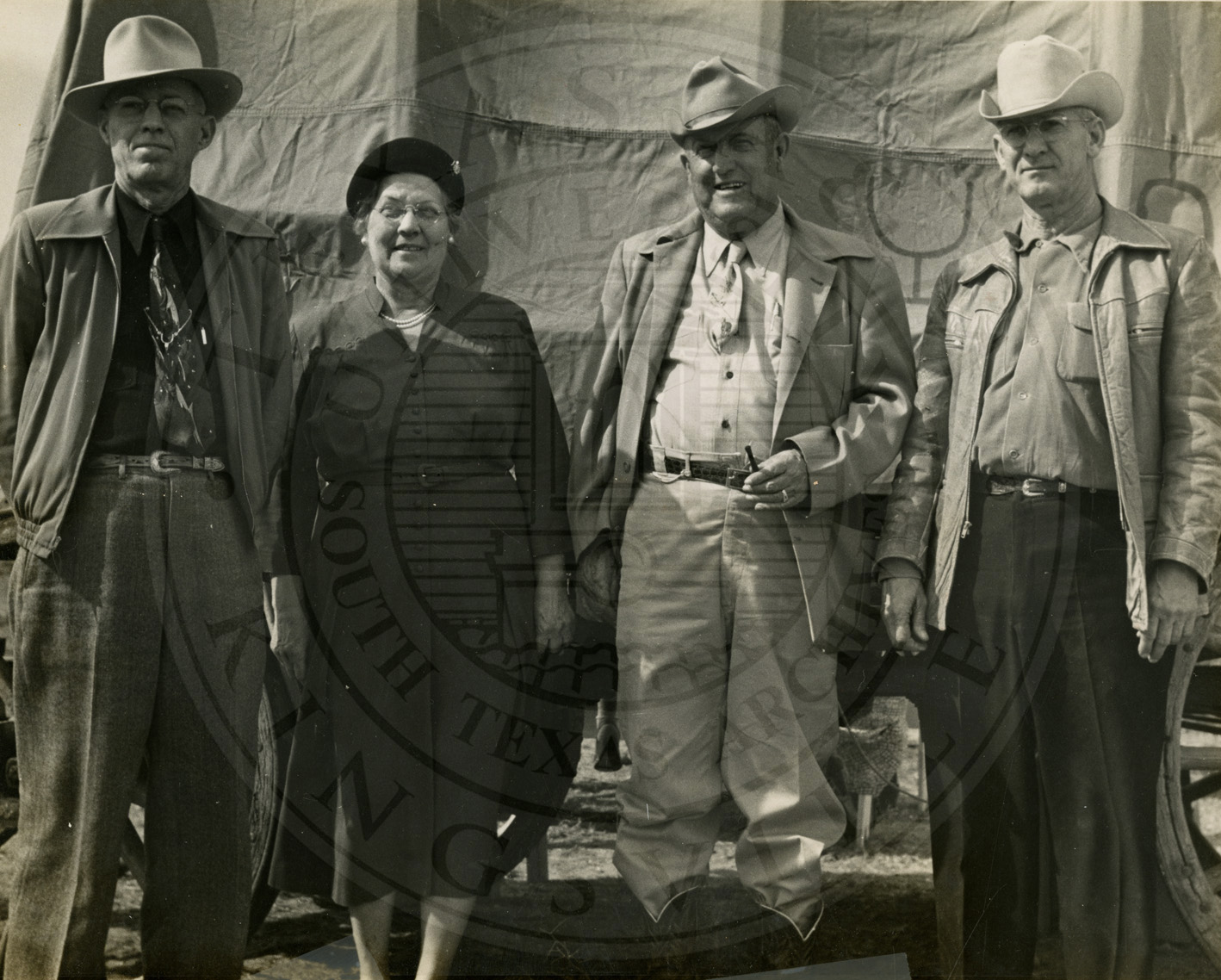 Standing in front of Graves' Peeler's chuckwagon on a longhorn roundup are, L-to-R: Grady Peeler; Mary Alice "Mamie" Peeler Shannon ; Alonzo, Peeler, Sr.; and Travis Peeler. 1950s. |