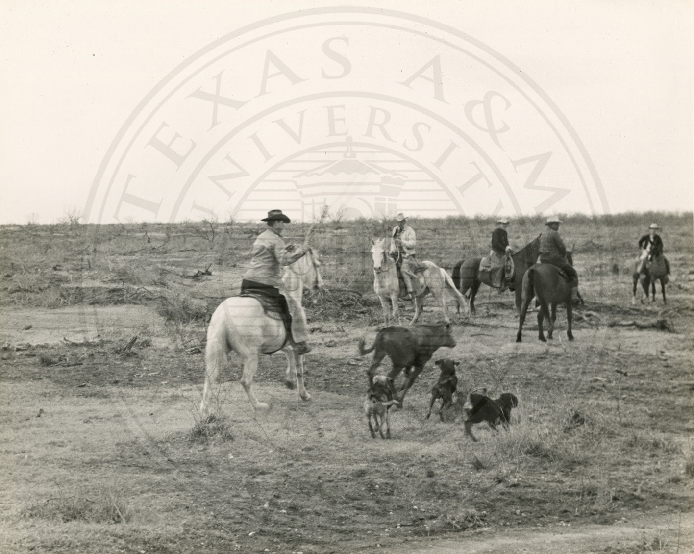 Men on horseback with three dogs chasing a calf. Caption reads: