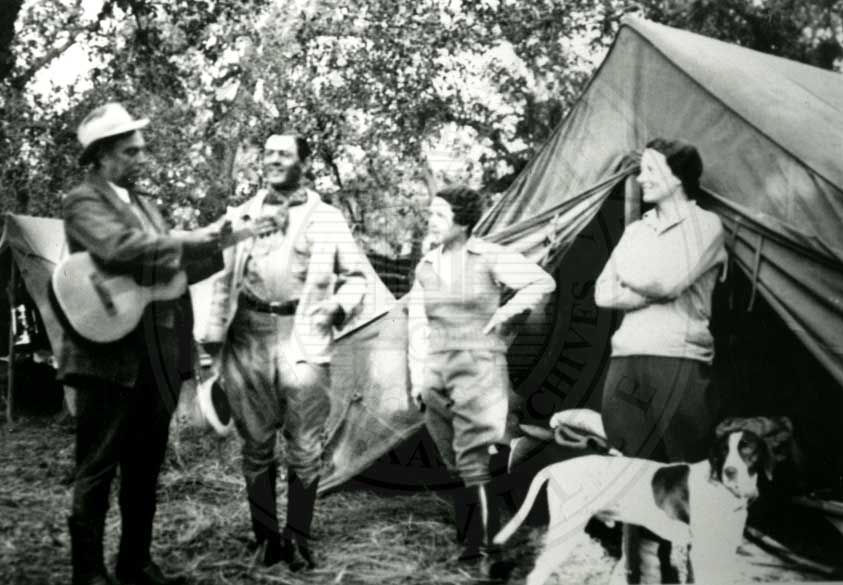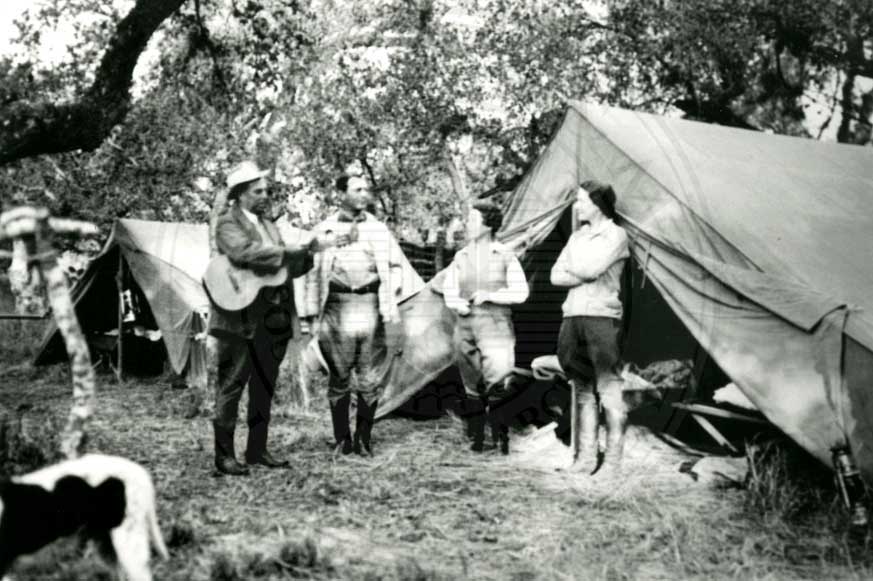 Johnny Kenedy with guitar standing with Robert J. Kleberg, Elena Seuss Kenedy, and Helen Kleberg in front of tents at camp