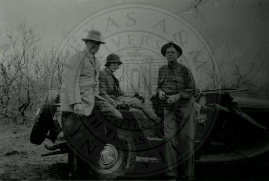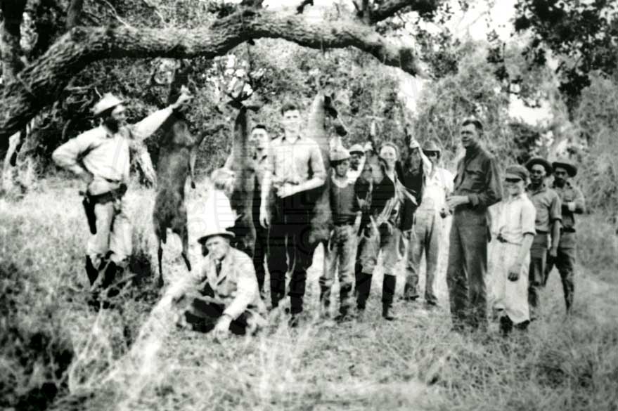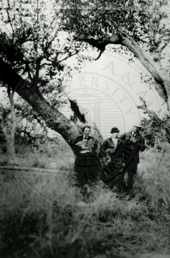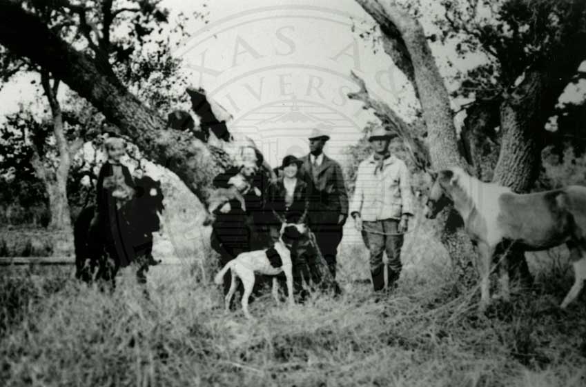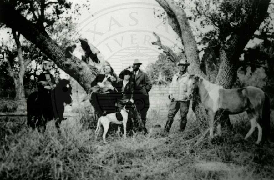 Robert J. Kleberg, Charles M. Armstrong, Helenita (immediately in back of Charles) young John Armstrong, Ike Klampmann, young Tobin Armstrong, Helen Kleberg, Beto Mendietta, Ike Klampmann, Sr., Charles M. Armstrong, Jr. and two unidentified workers gathered at camp