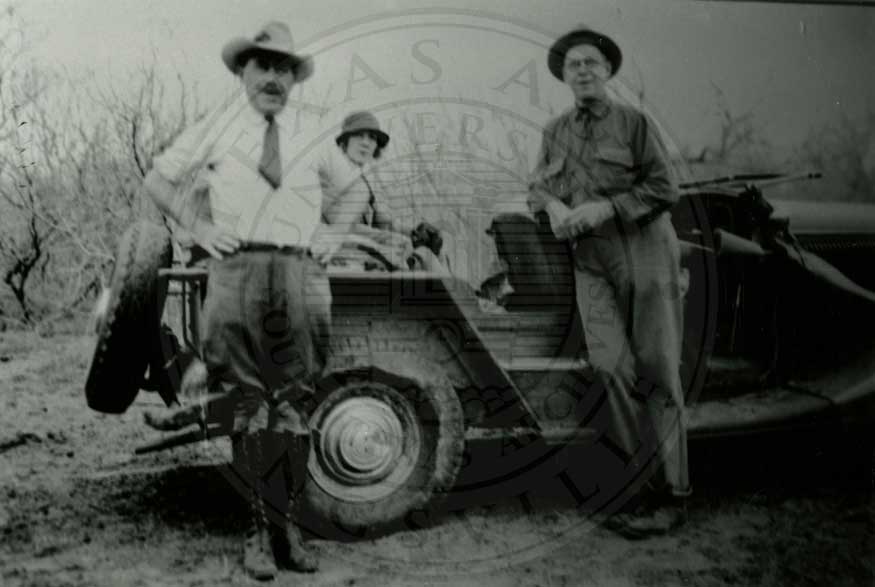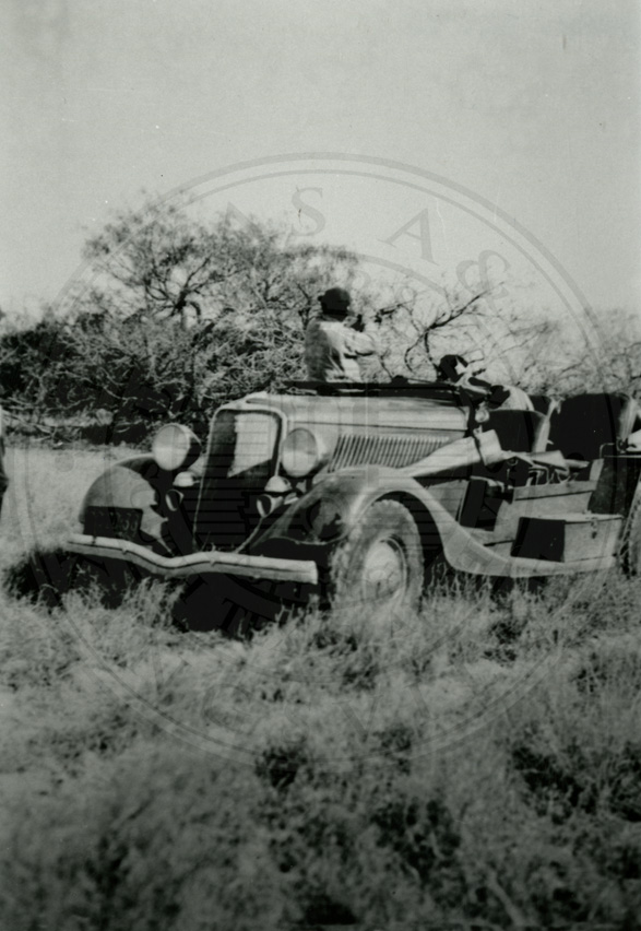 Unknown man shooting from hunting car. 1933 car at camp Los Amigos near the Norias