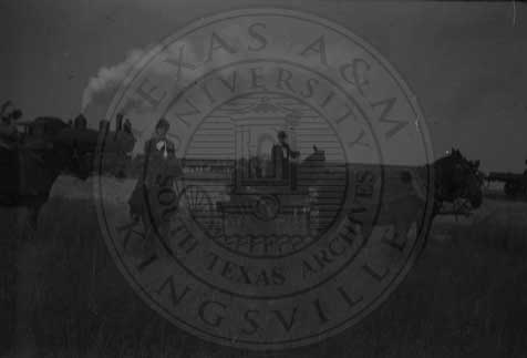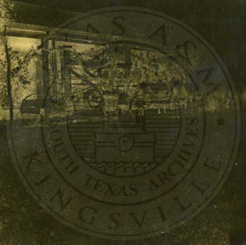 Engine of old train with man in buggy and man on horseback. Ca 1904. On St. Louis, Brownsville and Mexico line south of Kingsville area