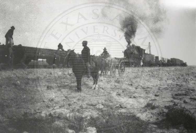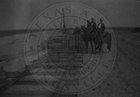 Men standing on flatbed train car, and man on horse, and man in buggy with train engine in background as St. Louis, Brownsville & Mexico RR line is being built south of Kingsville ca 1904. |