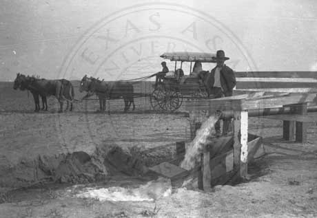 Water well flowing horizontally into the ground. Two men in a buggy and one man standing by the well. On the Armstrong Ranch.