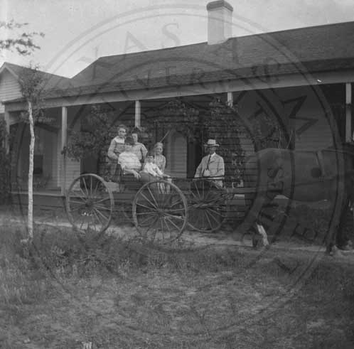 Horse and buggy with people sitting in front of ranch house on Armstrong Ranch |