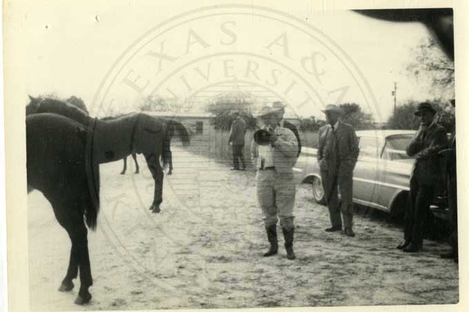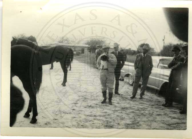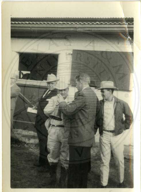 J.K. Northway with bullhorn and four unidentified men at stables. |