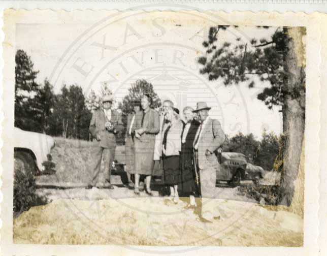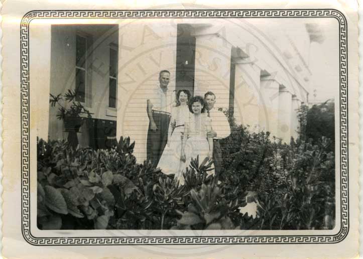 Two unidentified couples on front porch of Main House at King ranch. |