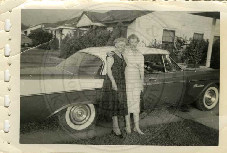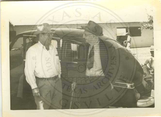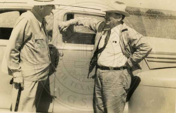 J.K. Northway and unidenified man talking beside car. |