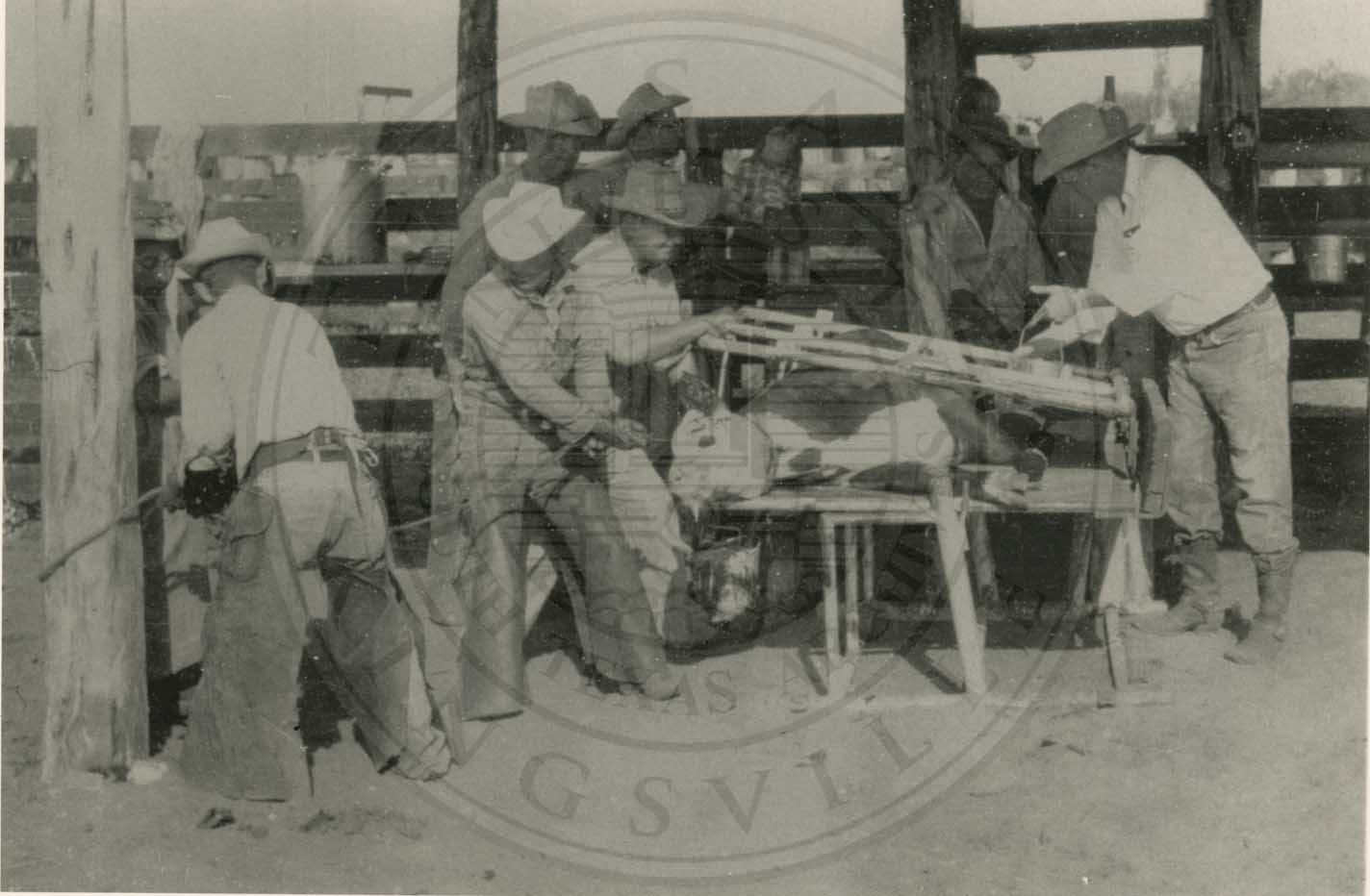 Vaqueros working a calf on a marking table. The marking table reduces the effort of handling calves, replacing the process of roping, throwing, and tying calves to be marked and branded. Photo from King Ranch Archives