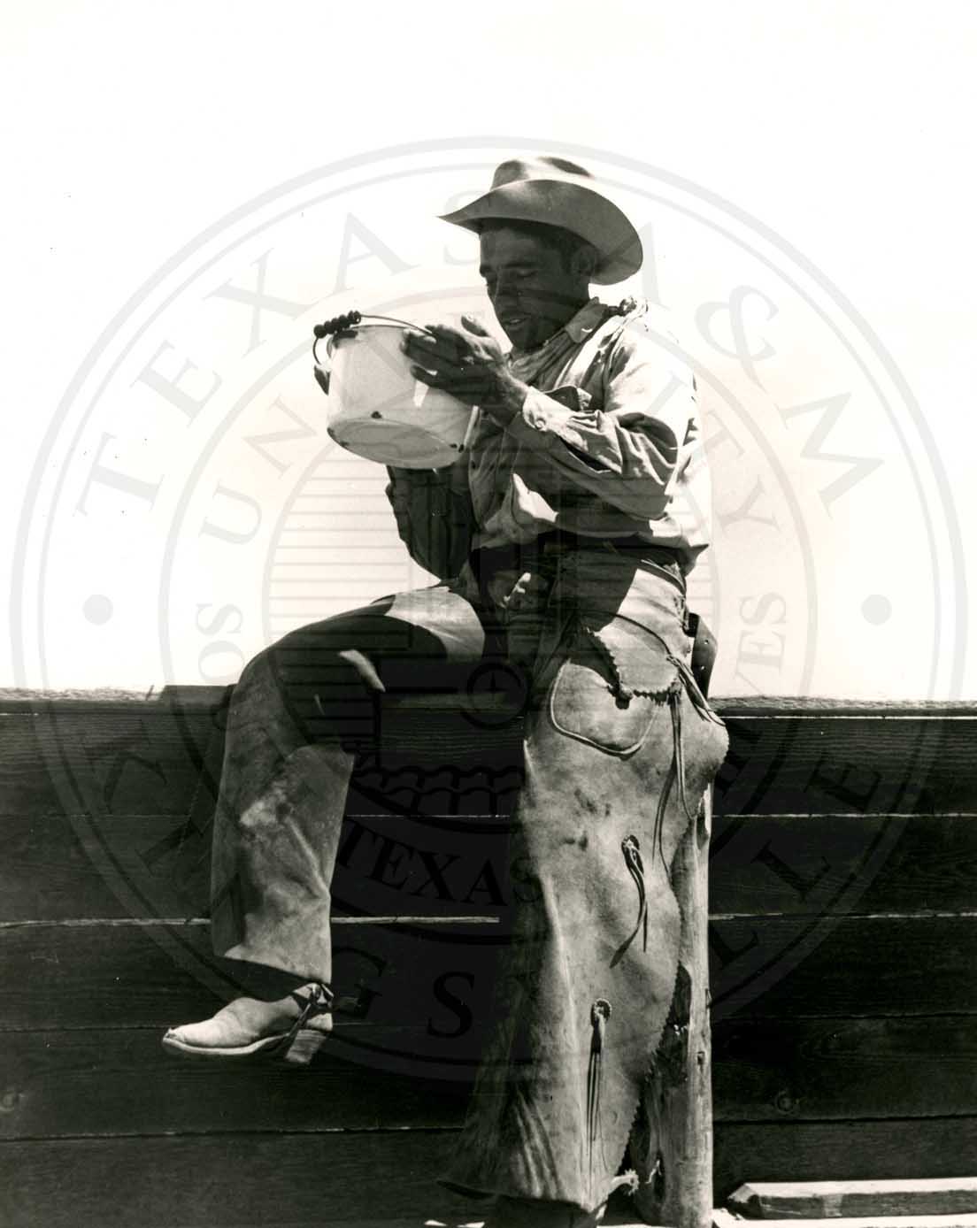 Vaquero in his chaps taking a water break in the corral. King Ranch Archives