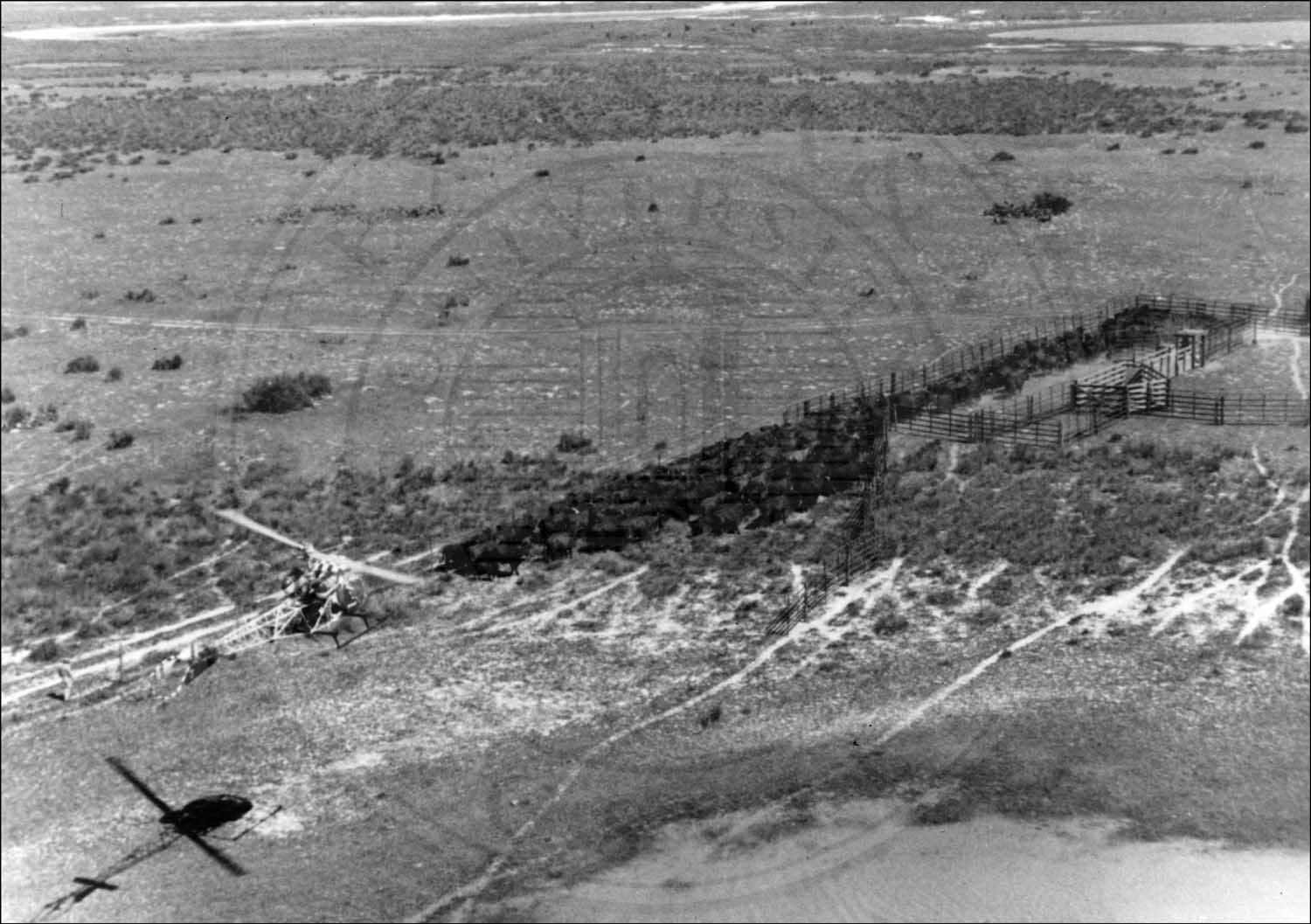Roundup by helicopter in South Texas. Assisted by mounted cowboys, helicopters quickly work large pastures. John E. Conner Museum photo. |