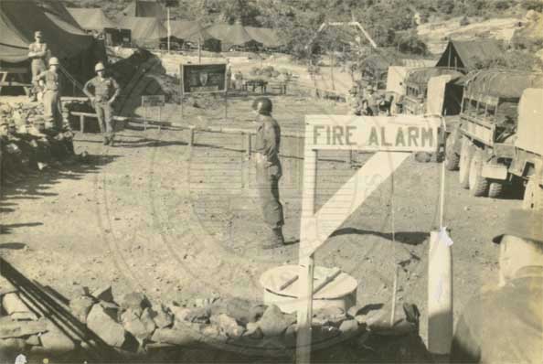 Soldiers in camp, a fire alarm sign in the foreground. |