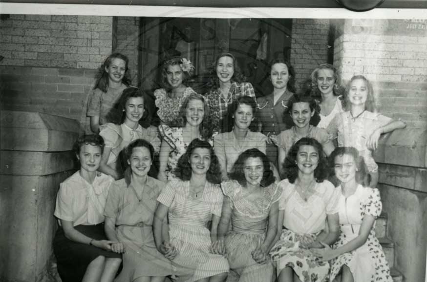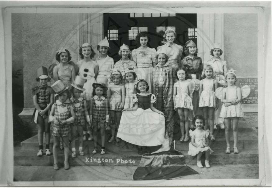 Bluebonnet Drama Club founding members group shot with girls wearing Dairy Maid costumes because they rode on the Jersey Products Dairy float in the parade. Includes are top row, l-r: Betty Finnegan, Lorene Huffman, Ira Bess Pittman, Vivian Dietz, Leslie Tanner, Mary Louise Walton. front row, l-r: Winnifred House, Robbie Conner, Mary Helen Calloway, mary Margaret Keepers, Mary Jane, Harrel, Anna Mae Nierman, Ruth Lawrence |