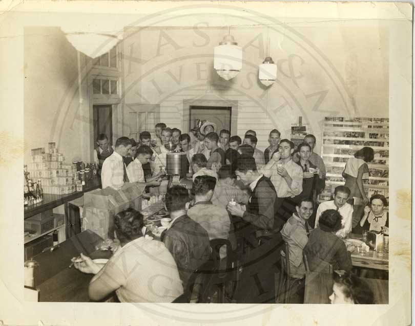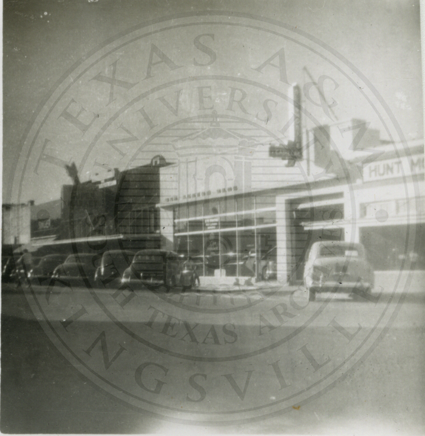 Inside Tejac’s or Prof. Lanier’s A&I store located on northeast corner of Santa Gertrudis & Armstrong. Ca 1940. 4” x 5” black & white snap shot