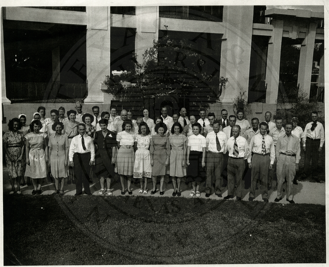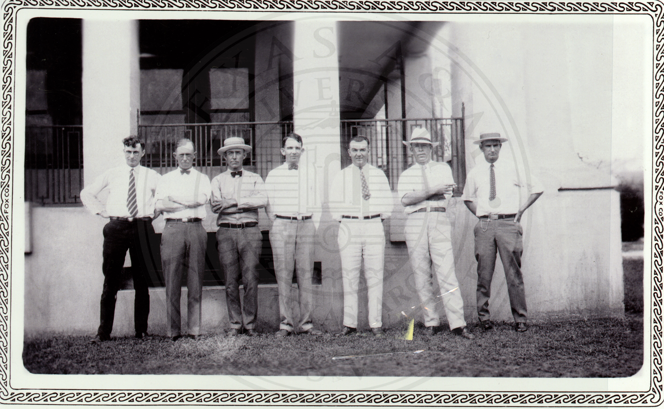 Railroad employees in front of Casa Ricardo grounds, ca 1926. on right is Phyrn (Perkins) Brossette. Digital copy of original