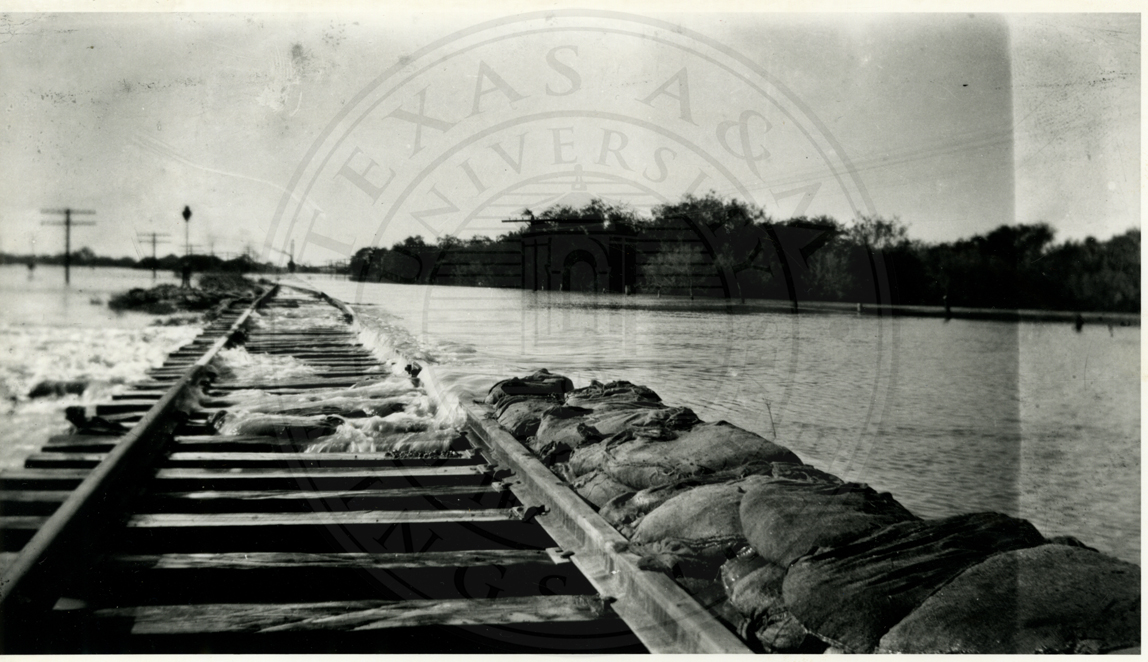 Train tracks showing flooded area on Nueces River. Ca 1950. Digital copy of original