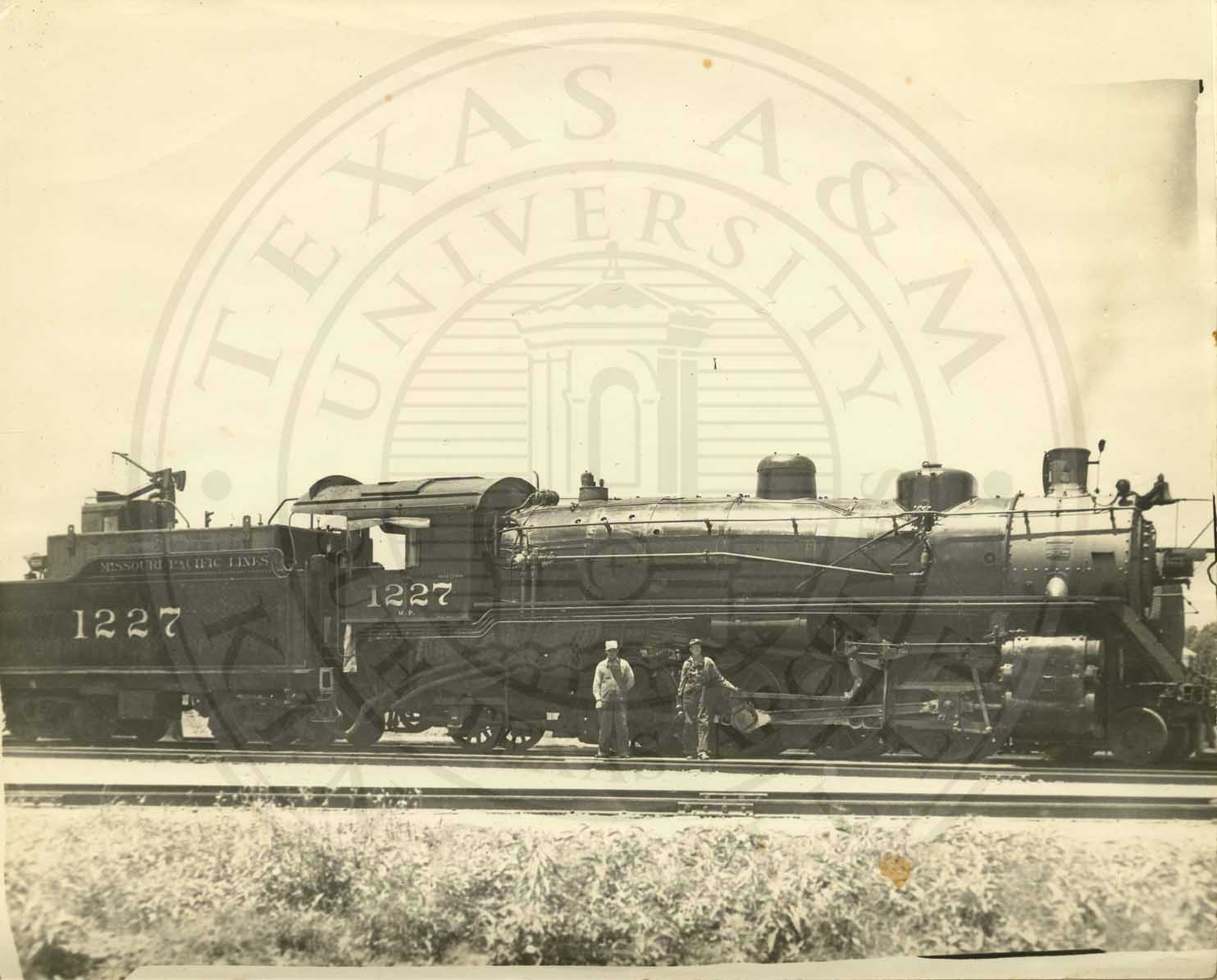 Two men in front of Missouri Pacific train engine 1227. Man on right is O.R. Hayes