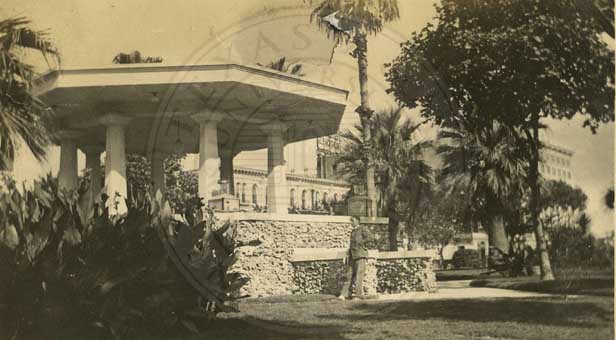 Band stand in park. Donor says it is in Kingsville, TX. Stone siding is unlike any other bandstand photo seen recently.