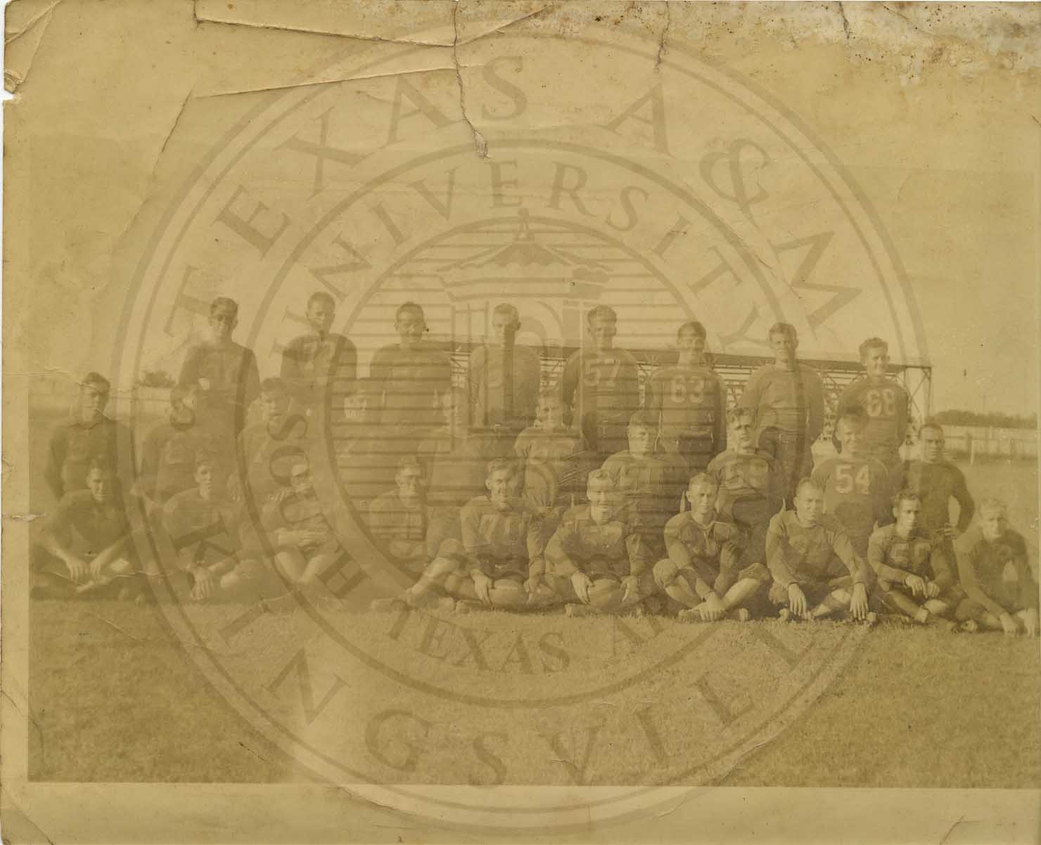 Mid to late 1930s photo of Texas College of Arts & Industries football team. Includes in back row, l-r: Gene McCormick, Harry Hinton, Dick Kercheville, Charles Cumberland, L.A. Walker, Lupe King, Allen Barnes, Bill Huston. |