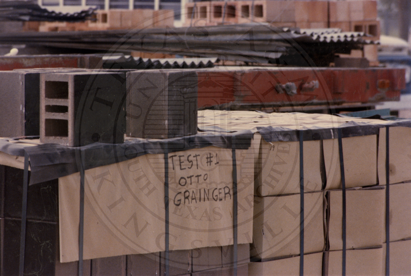 Stack of brick with a sign "Test #1 Otto Grainger