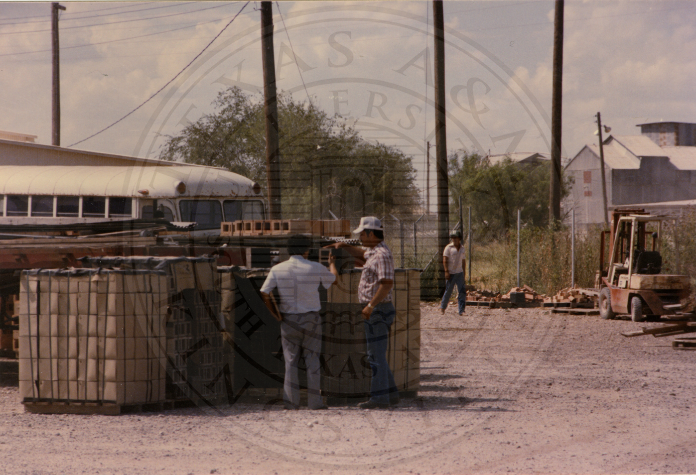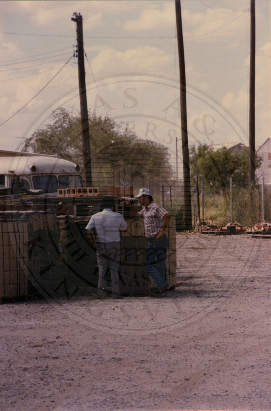 Two unidentified men talking and one is leaning on a pallet of bricks |