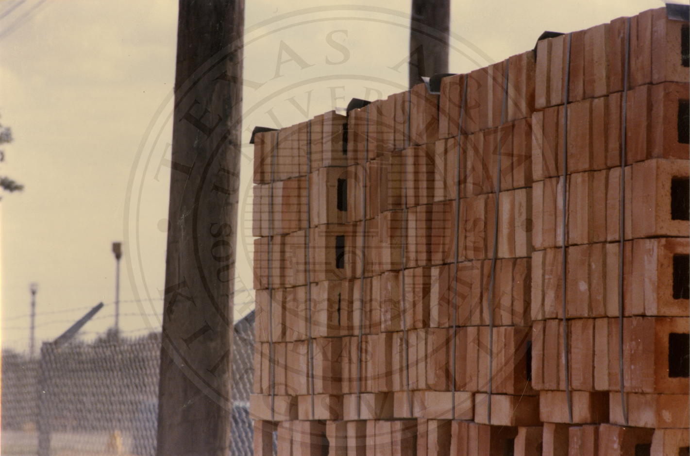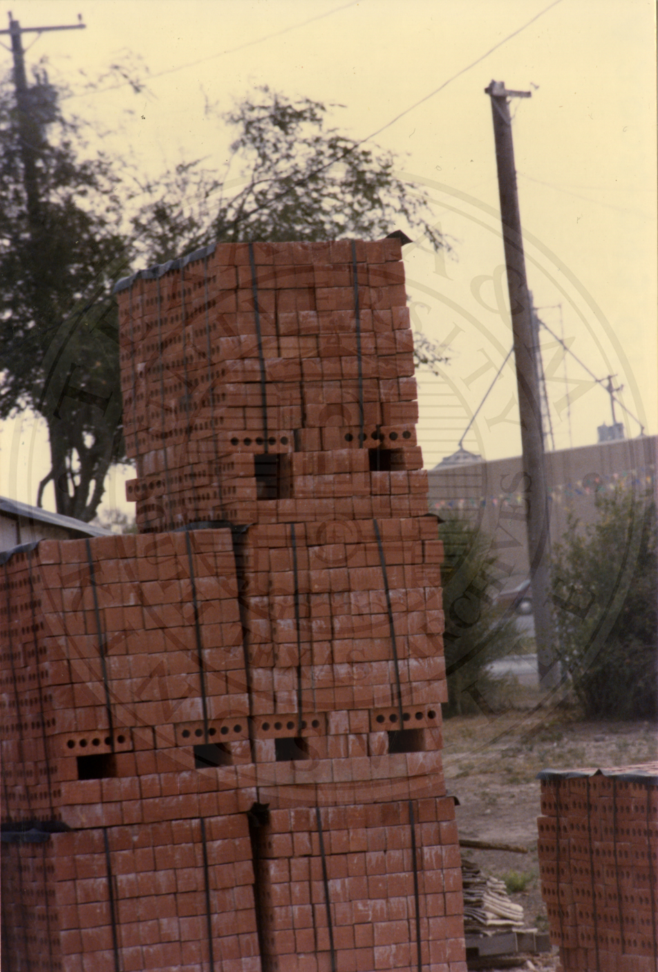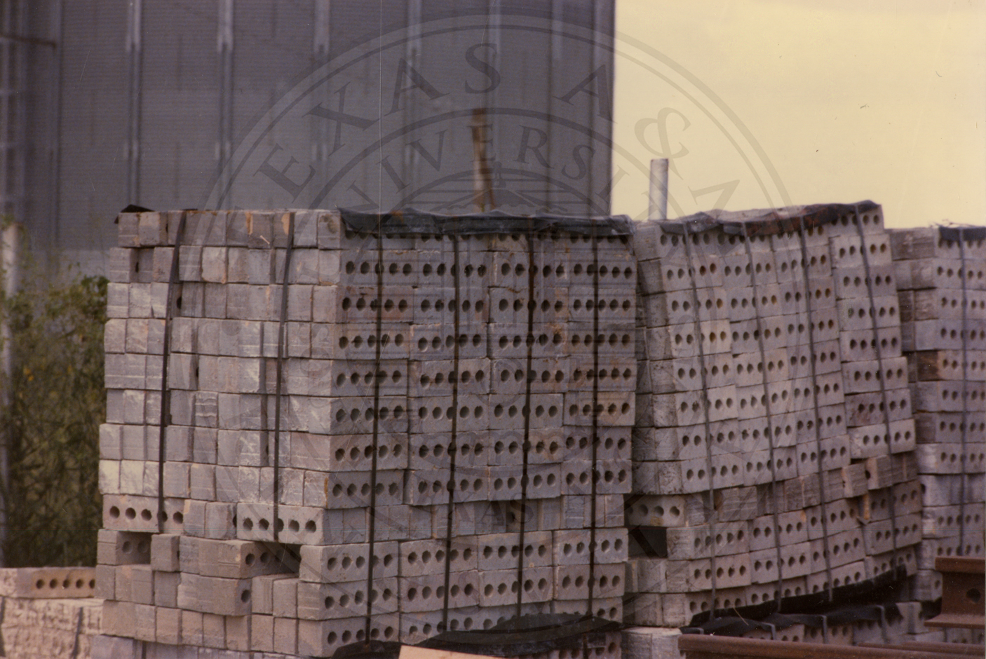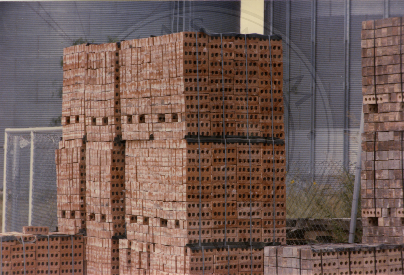 Several pallets of bricks at Camargo Brick, a possible kiln is seen in the background |