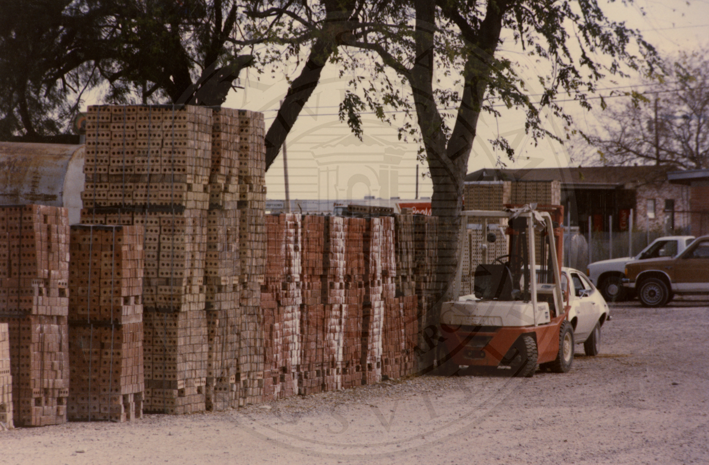 Several pallets of bricks from Camargo Brick. Three cars and a fork lift are seen in the background