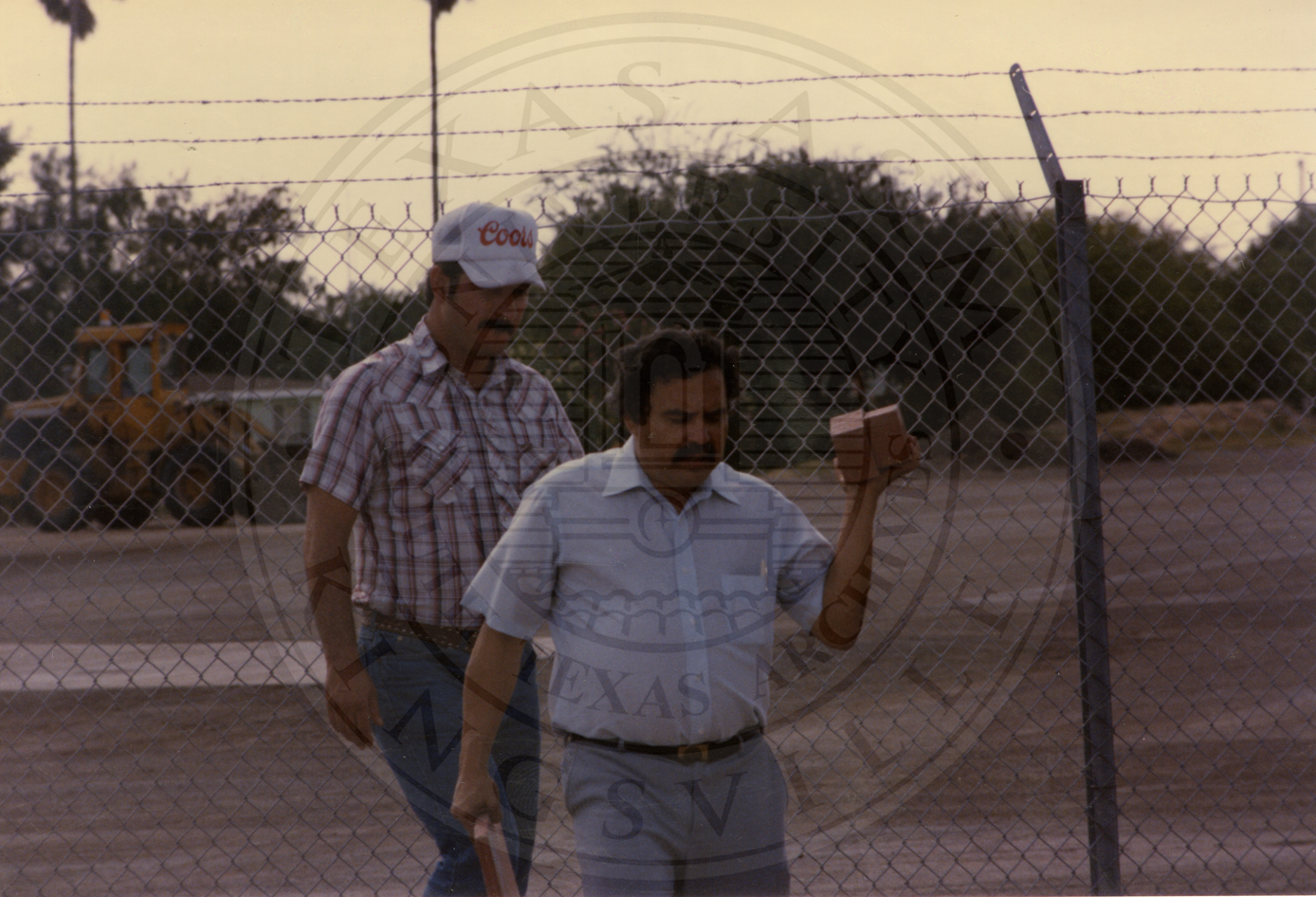 Two unidentified men walking behind each other. The man in the front is carrying a brick and the man in the back wears a Coors hat |