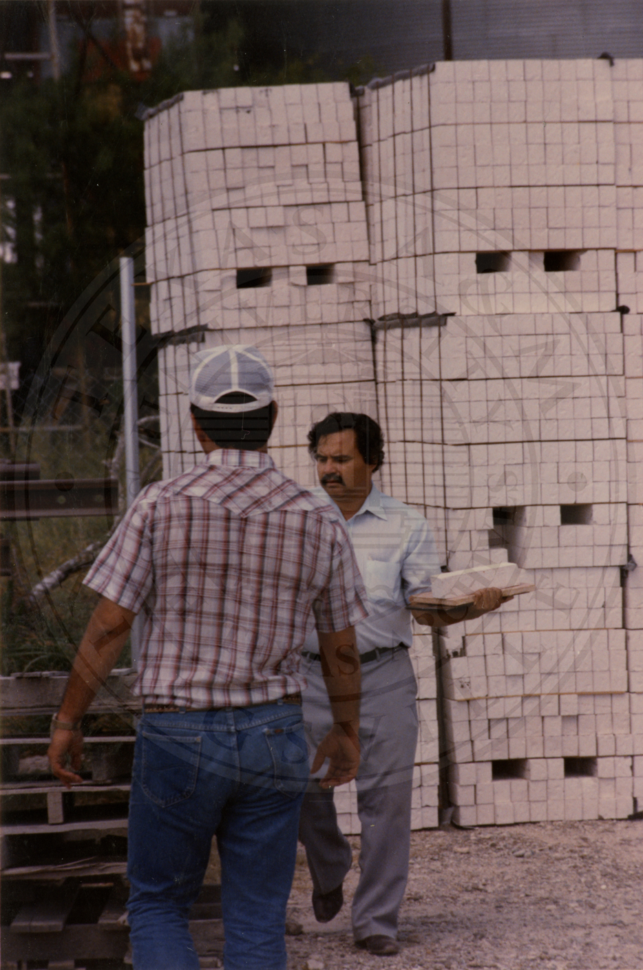 Two unidentified men working on a pallet of bricks from Camargo Brick. Only their heads are visible behind the pallet |