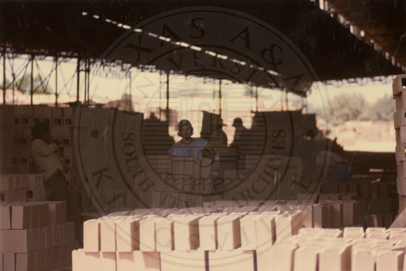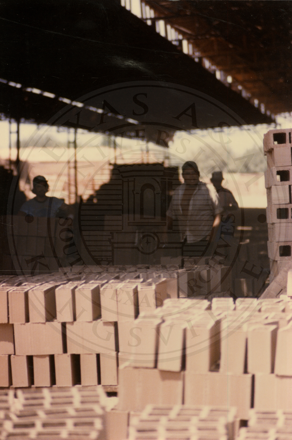 Several pallets of bricks from Camargo Brick under a covered area. There are several unidentified men in the background