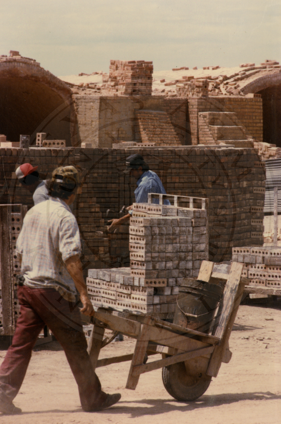 Two unidentified men working on a pallet of bricks from Camargo Brick in the background. One unidentified man walking behind a push cart |