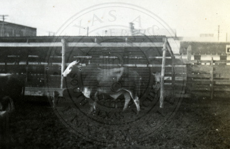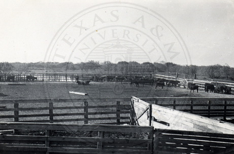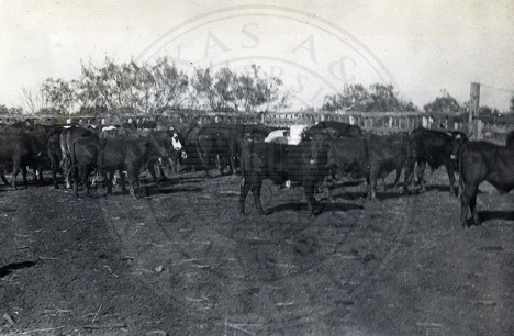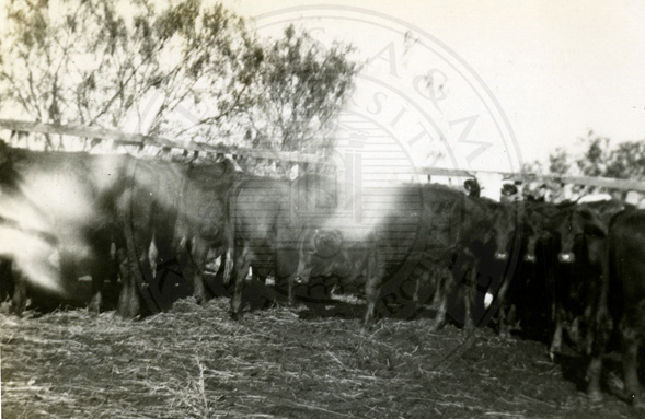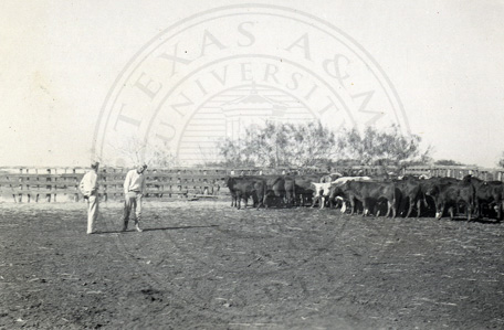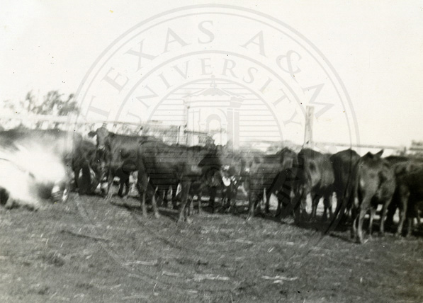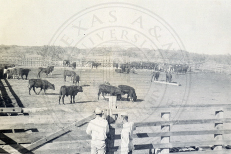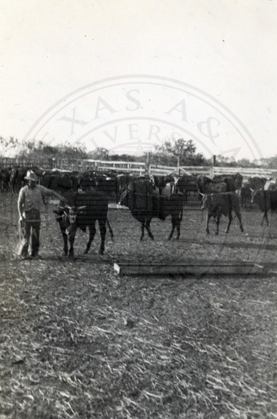 Santa Gertrudis calves about 9 months old. These are range cattle. Photographed on open land and in corrals. Sam and Ed on King Ranch.