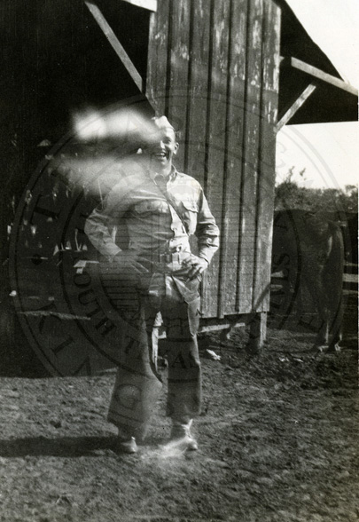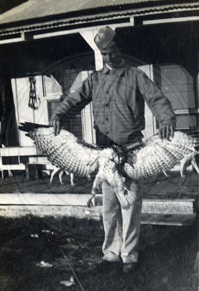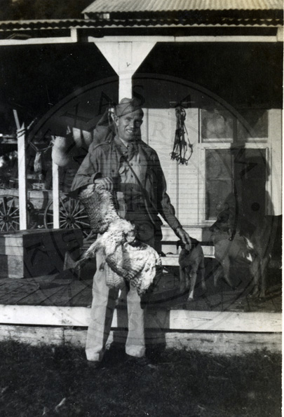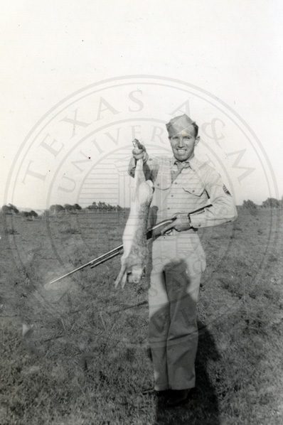 Sgt. Jasper Lee Hartline has just slain this jackrabbit after a hand fight. 11/06/43 King Ranch. The first jack rabbit Hartline has ever seen. |
